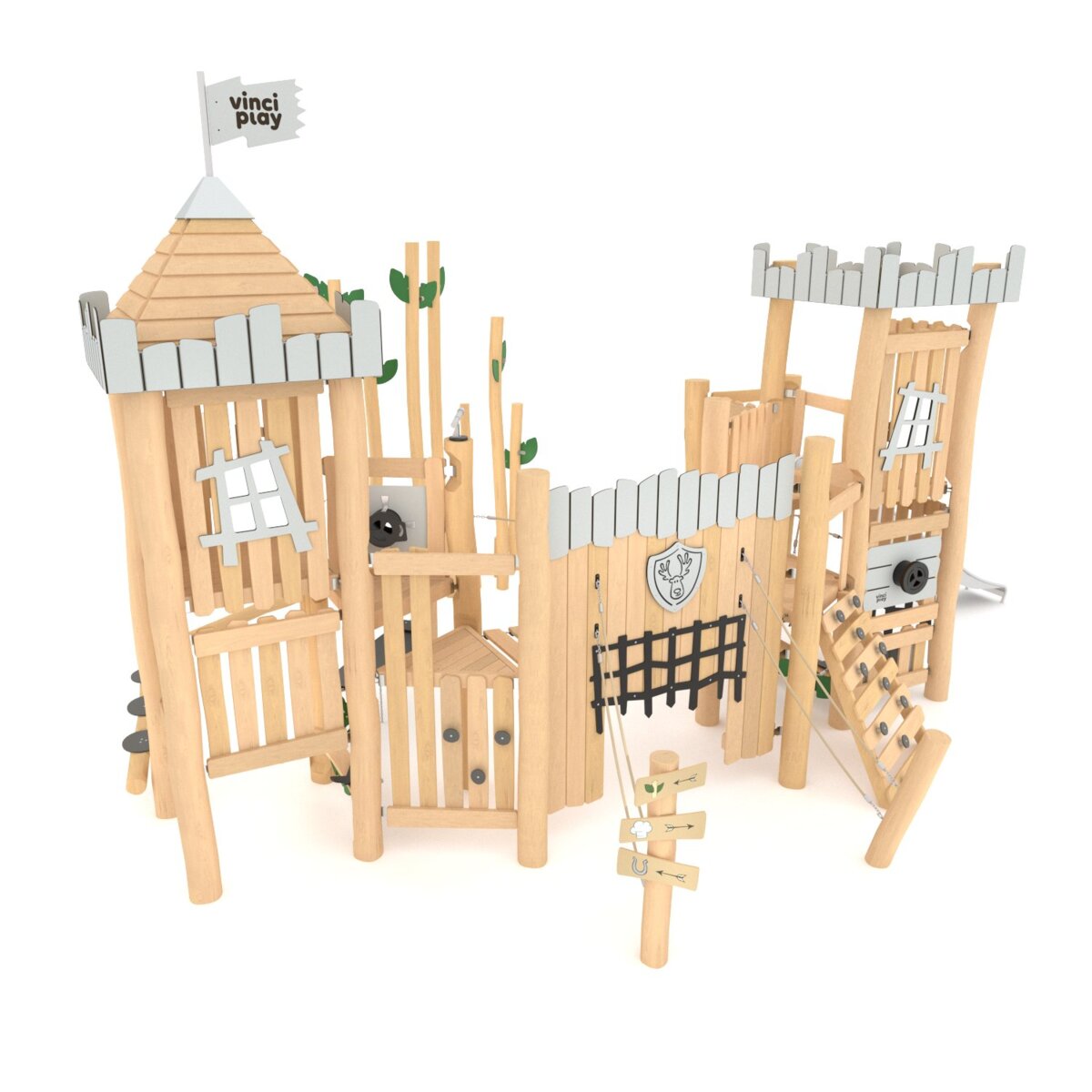 En stor och rejäl borg som kombinerar ett högt lekvärde och sociala rollekar med flera olika aktivitetsmöjligheter. Borgen har flera olika torn som man når via med spännande hängbroar och trappor för att sedan åka ner för rutschbanan i en härlig fart. De låga diskarna kan fungera både som kök och affär. Robinia smälter fint in i utemiljön och ger ett mjukt och naturligt intryck. Det är ett träslag med hög motståndskraft mot väderpåverkan och har förmågan att absorbera minimalt med vatten och utmärker sig genom sin extremt långa hållbarhet. Rep av stål, täckt med flätad polypropen. Rutschkana i rostfritt stål. Monteras enligt installationsmanual. Vid installation ska alltid den medföljande manualen användas. Den senaste versionen finns att tillgå på begäran.