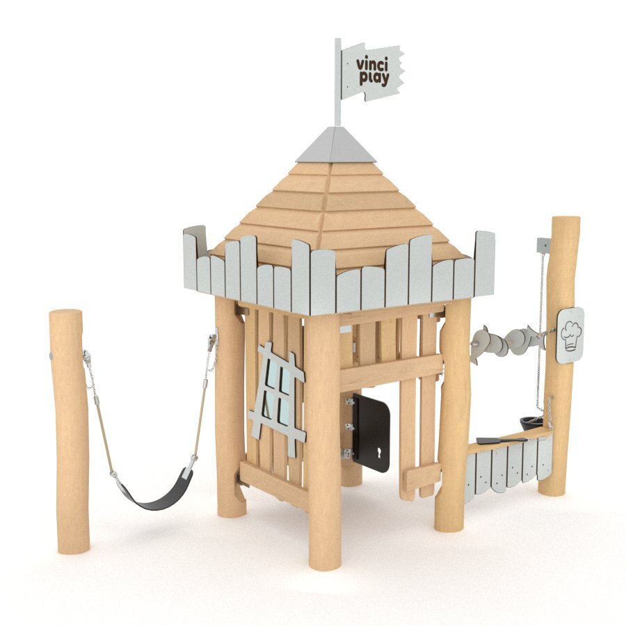 Denna borg passar mycket bra för de yngre barnens sociala och aktiva rollekar i anknytning till sandlådan. Här får barnen möjlighet att väga, ösa och hissa sanden upp och ner i korgen. Den låga disken kan fungera både som affär, kök och glasskiosk. Bältesgungan lockar till härlig och hisnande lek. Robinia smälter fint in i utemiljön och ger ett mjukt och naturligt intryck. Det är ett träslag med hög motståndskraft mot väderpåverkan och har förmågan att absorbera minimalt med vatten och utmärker sig genom sin extremt långa hållbarhet. Monteras enligt installationsmanual. Vid installation ska alltid den medföljande manualen användas. Den senaste versionen finns att tillgå på begäran.