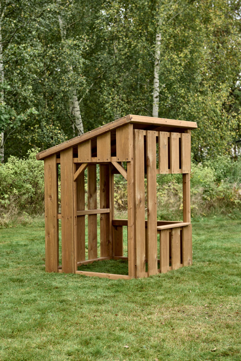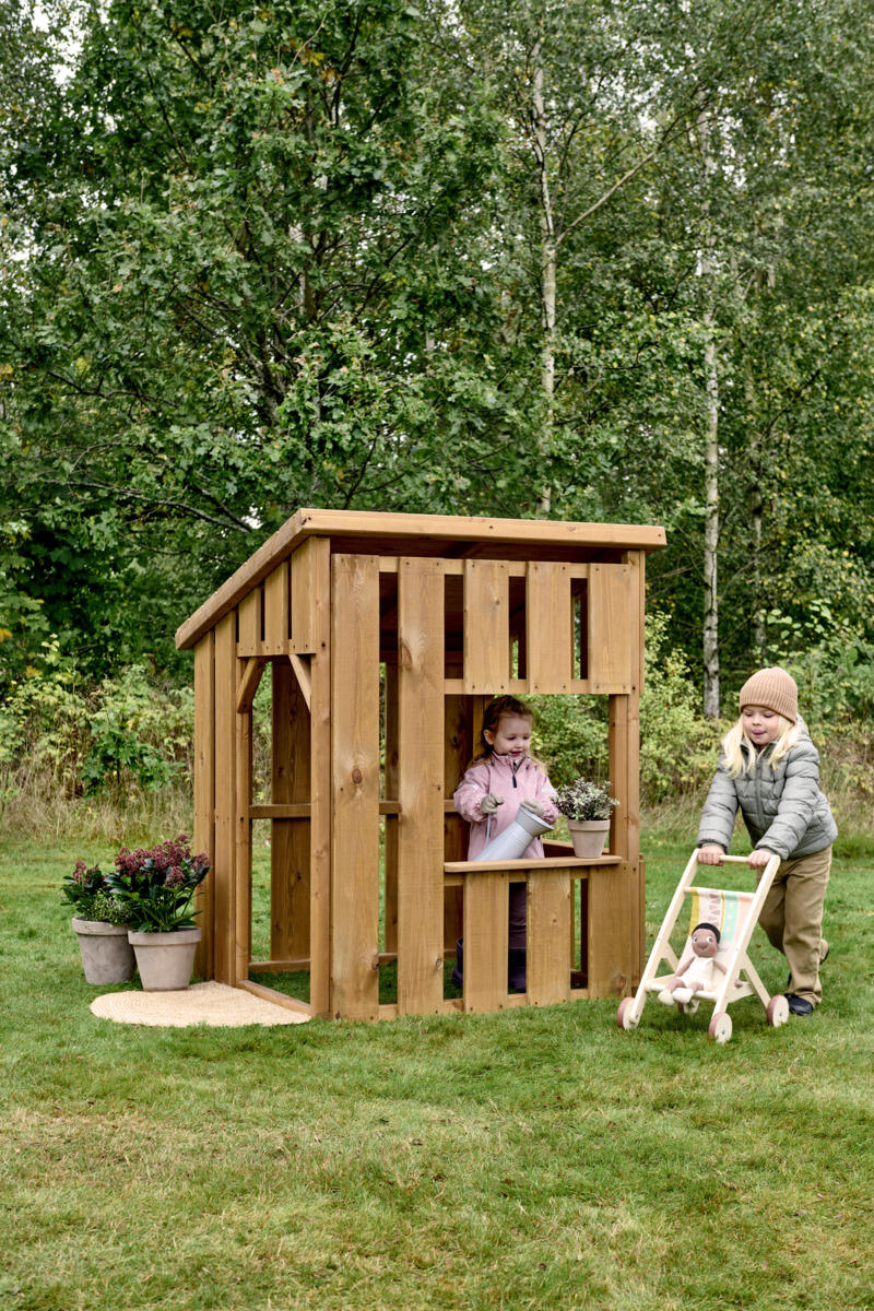 En liten lekstuga som är framtagen för de yngsta barnen. Med öppna ribbväggar, två fönster och en dörröppning som släpper in naturligt ljus samtidigt som vuxna enkelt kan få en bra överblick. Perfekt för fantasifull lek, rollek och socialt samspel. Det sluttande taket ger skydd vid både sol och regn. Tillverkad av FSC certifierad furu som är ytbehandlad med en oljebaserad lack. För markförankring behövs 4 st av 151134, eller 151133 för ytmontering. Levereras omonterad.