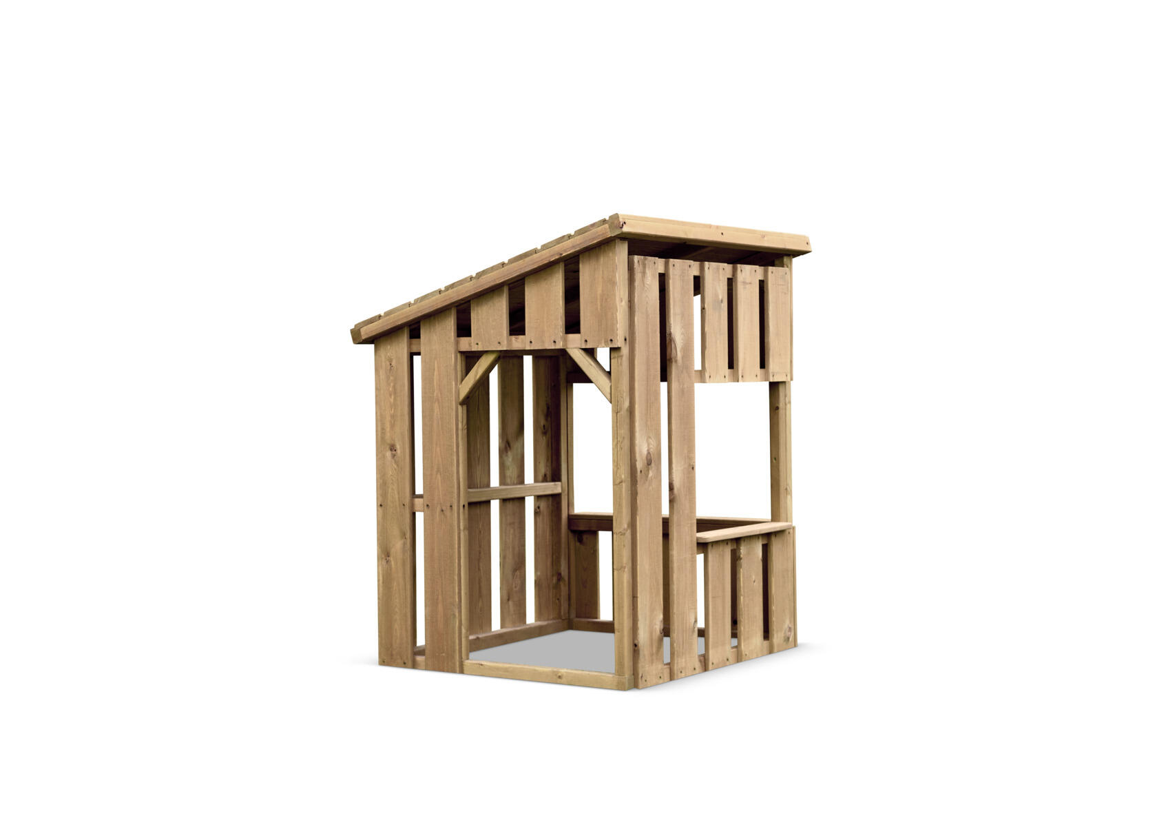 Skapa en inspirerande och lärorik utemiljö på förskolan med detta mångsidiga öppna lekhus. Det lilla huset har en öppen design för olika typer av utforskande, rollekar som affär, restaurang eller café som ger stimulans för barnens fantasi och kreativitet. Lekhuset är utrustat med en smal disk, 2 stora fönster och ett bakstycke med möjlighet att hänga upp saker på. Med en sida som är helt öppen kan både barnen och pedagogerna att ha överblick över vad som händer på gården. Av FSC-certifierad furu som är ytbehandlad med en vattenbaserad lack. Lösning för förankring säljs separat, för väggförankring behövs 2 st av artnr 151133, eller för markförankring behövs 4 st av 161297. Levereras omonterat.