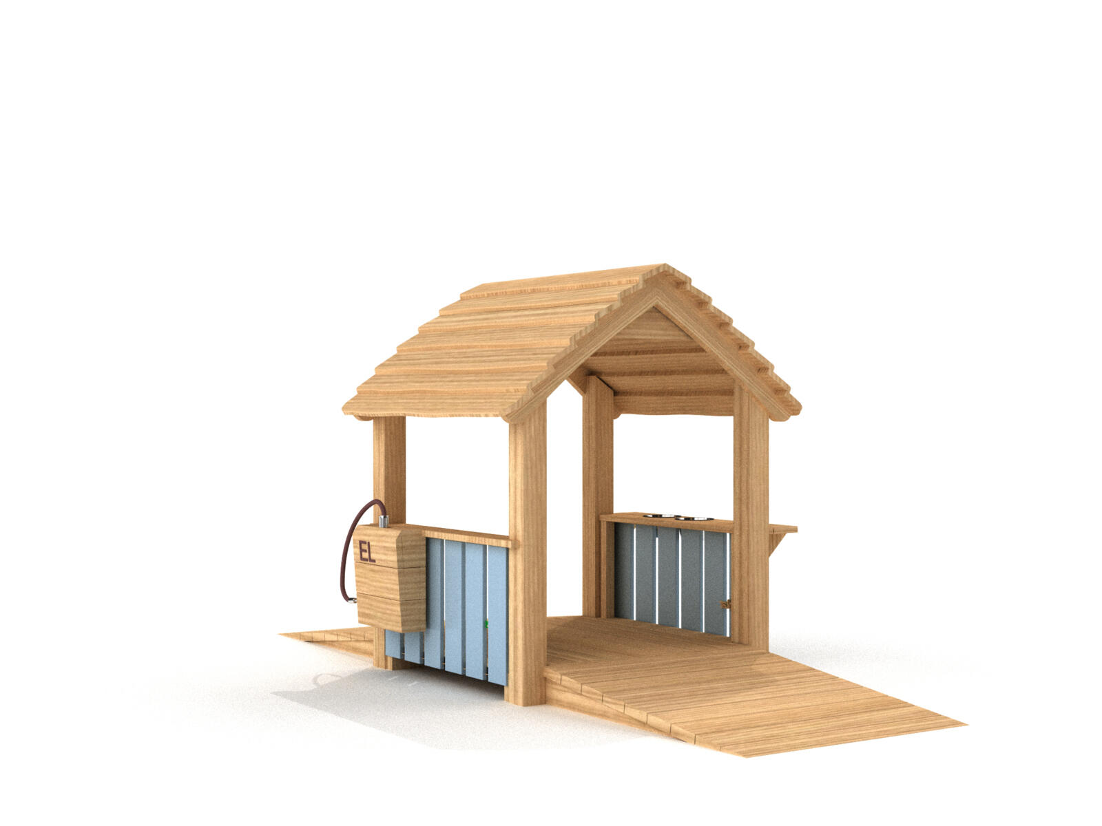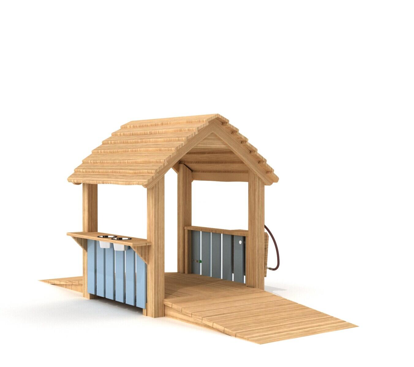 Med sitt naturliga intryck blir detta öppna lekhus ett mysigt inslag i utemiljön. Lekhuset är mångsidigt och kan inspirera till en mängd olika typer av rollekar som att leka affär, drive- through eller att ladda bilen vid elstolpen, dels fungerar det som en aktiv passage där barnen kan cykla igenom och interagera leken med rörelse. Den inkluderande rampen bjuder in alla barn till att delta och skapa roliga äventyr. Tillverkad av FSC-certifierad obehandlad Robinia, ett träslag som är känt för sin höga motståndskraft mot väderpåverkan. Paneler av HDPE. Robinia absorberar minimalt med vatten och utmärker sig genom sin långa hållbarhet.