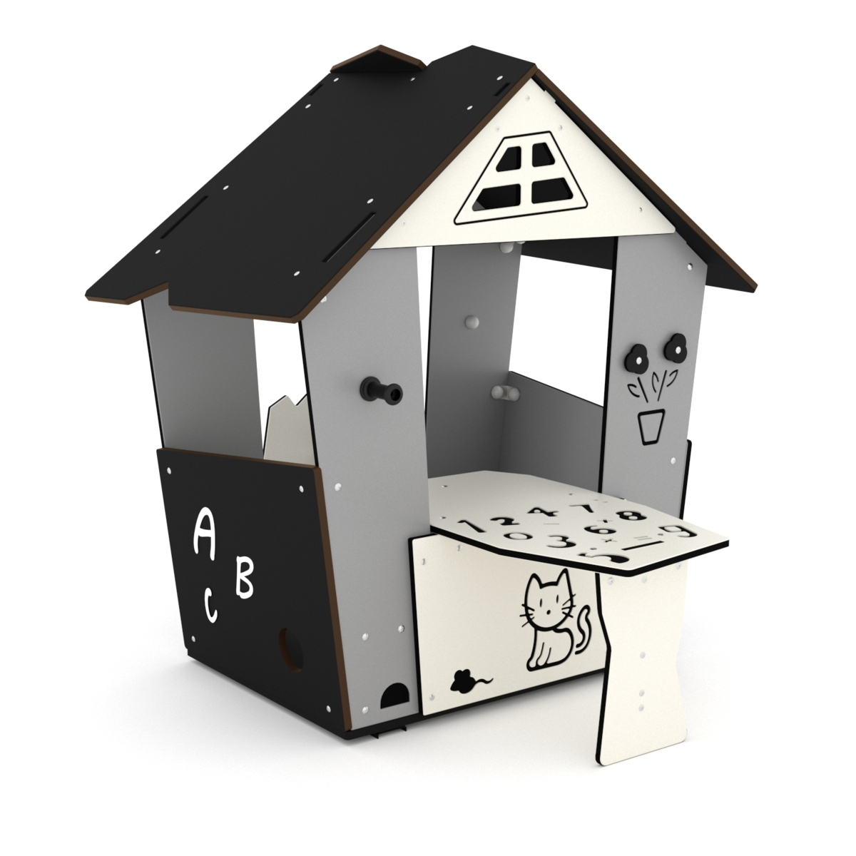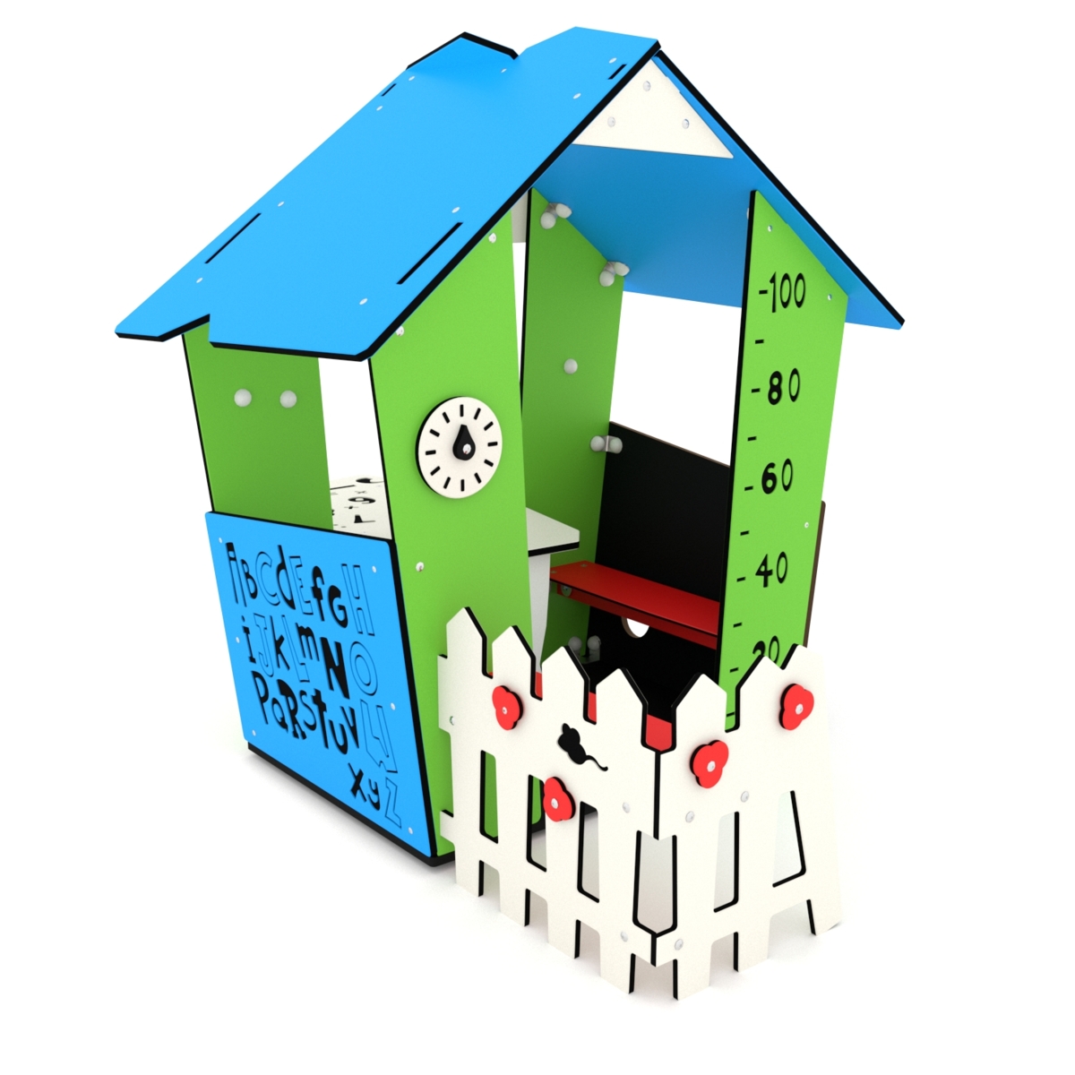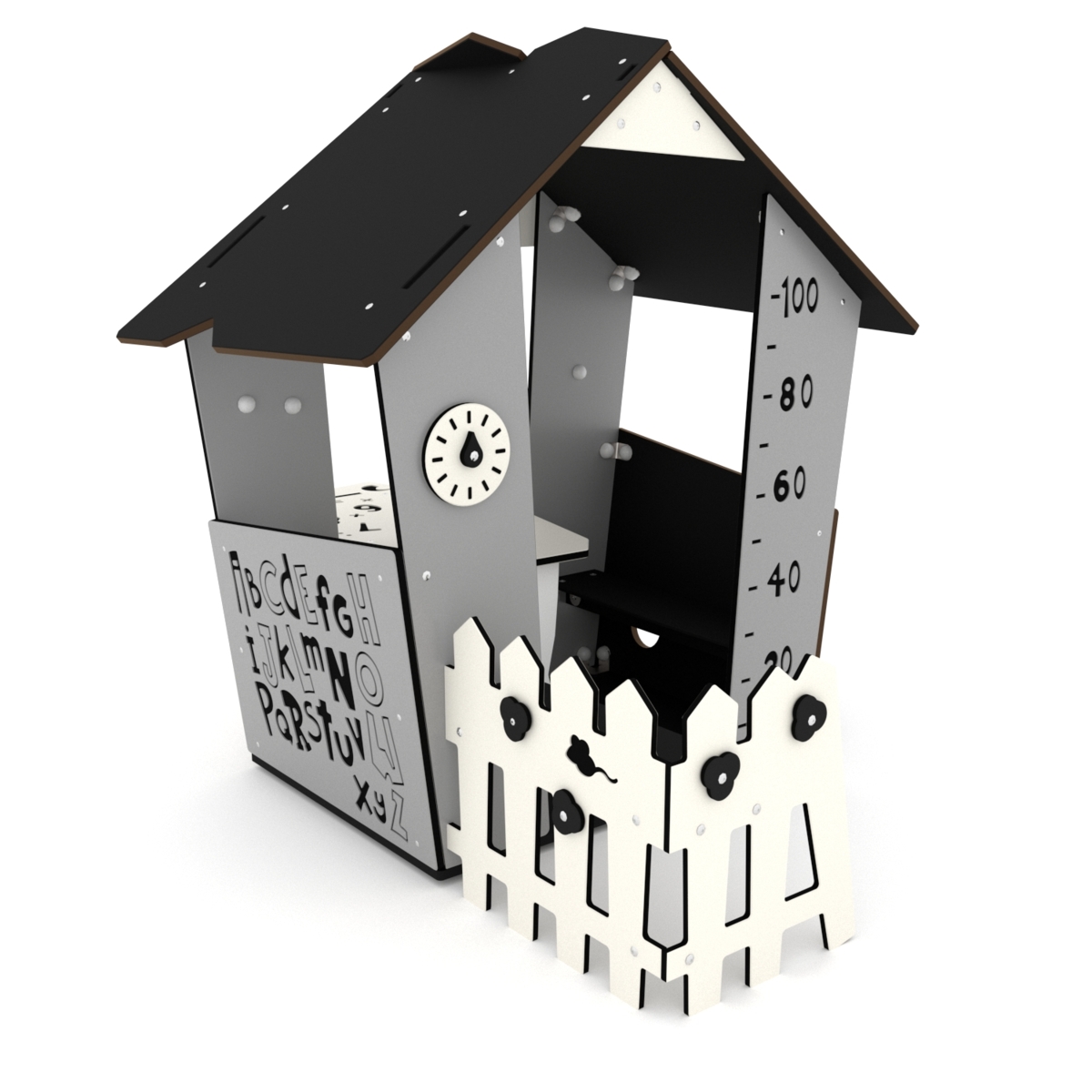 Ett lekhus i robinia utan golv. Kan t.ex. placeras direkt i sandlådan. Sittbänkar på båda sidorna i huset, samt ett bord. För exakta mått och övrig information, se dokument.
