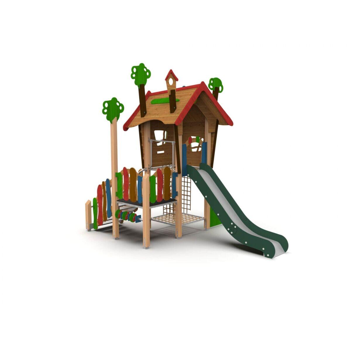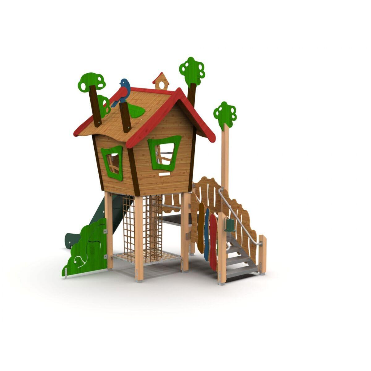 Trollskogen är ett sagoinspirerat lekhus i kombination med olika moment som passar perfekt i förskolans utemiljö. Vid trappan sitter en liten ”ringklocka” som gör leken ännu mer verklighetstrogen. Från lekhuset kan barnen svischa ner för en härlig rutschkana. Under huset finns ett spännande klätternät för att kunna klättra upp i huset. Leksystemet levereras i stort sett färdigmonterat för enkel installation. Konstruktionen är robust och tillverkad av grundbehandlat och laserat furu och stolpskor av varmförzinkat stål, med trappsteg i räfflad aluminium.