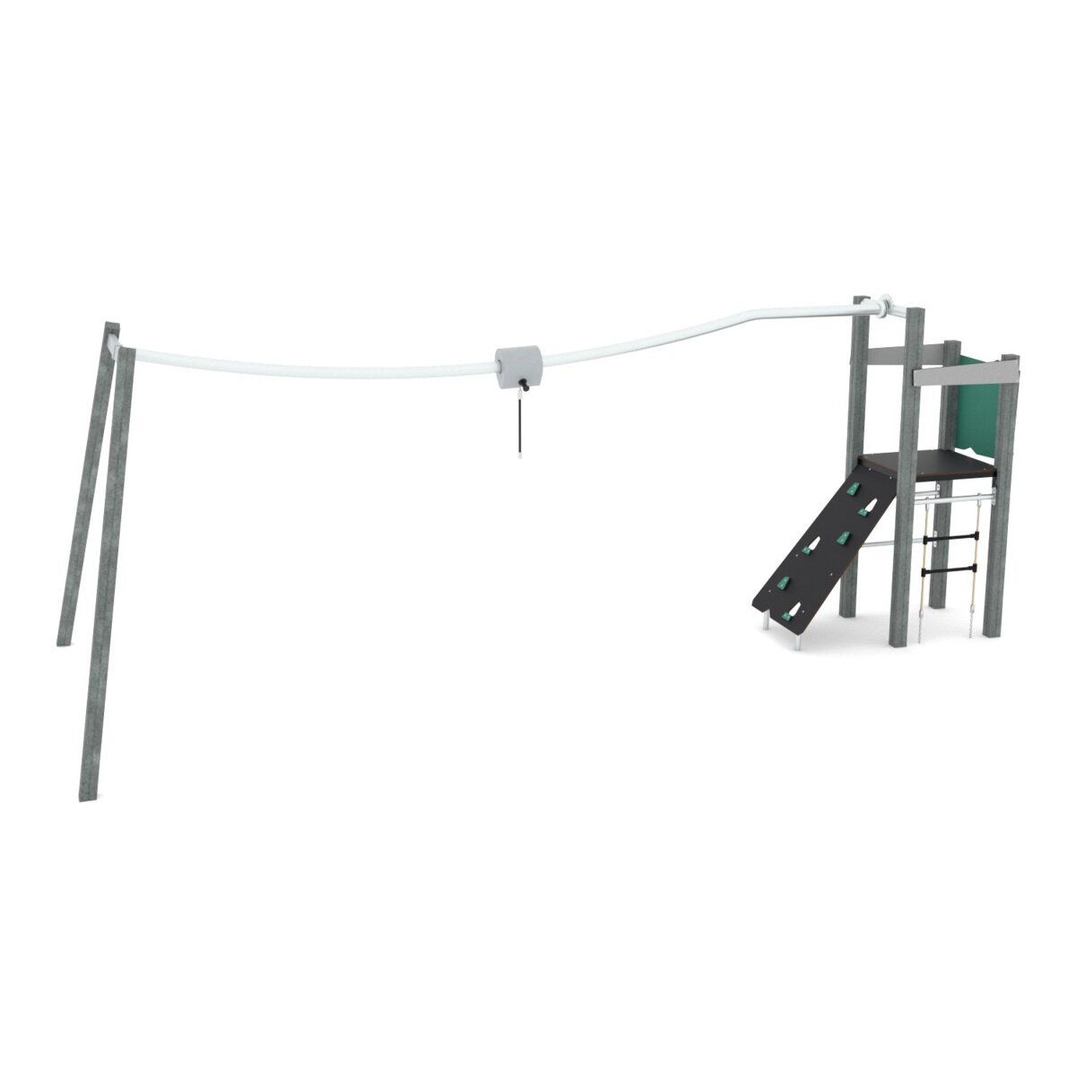 En linbana med plattform som lockar till rolig lek i utemiljön. De 3 olika sätten att ta sig upp på plattformen skapar variation och att sedan våga fara framåt i full fart blir en spännande upplevelse och ger en härlig känsla. Av galvaniserat och pulverlackerat stål. Halkfria plattformar av HPL och paneler av HDPE. Monteras enligt installationsmanual. Vid installation ska alltid den medföljande manualen användas. Den senaste versionen finns att tillgå på begäran. Inkluderar markförankring K1.