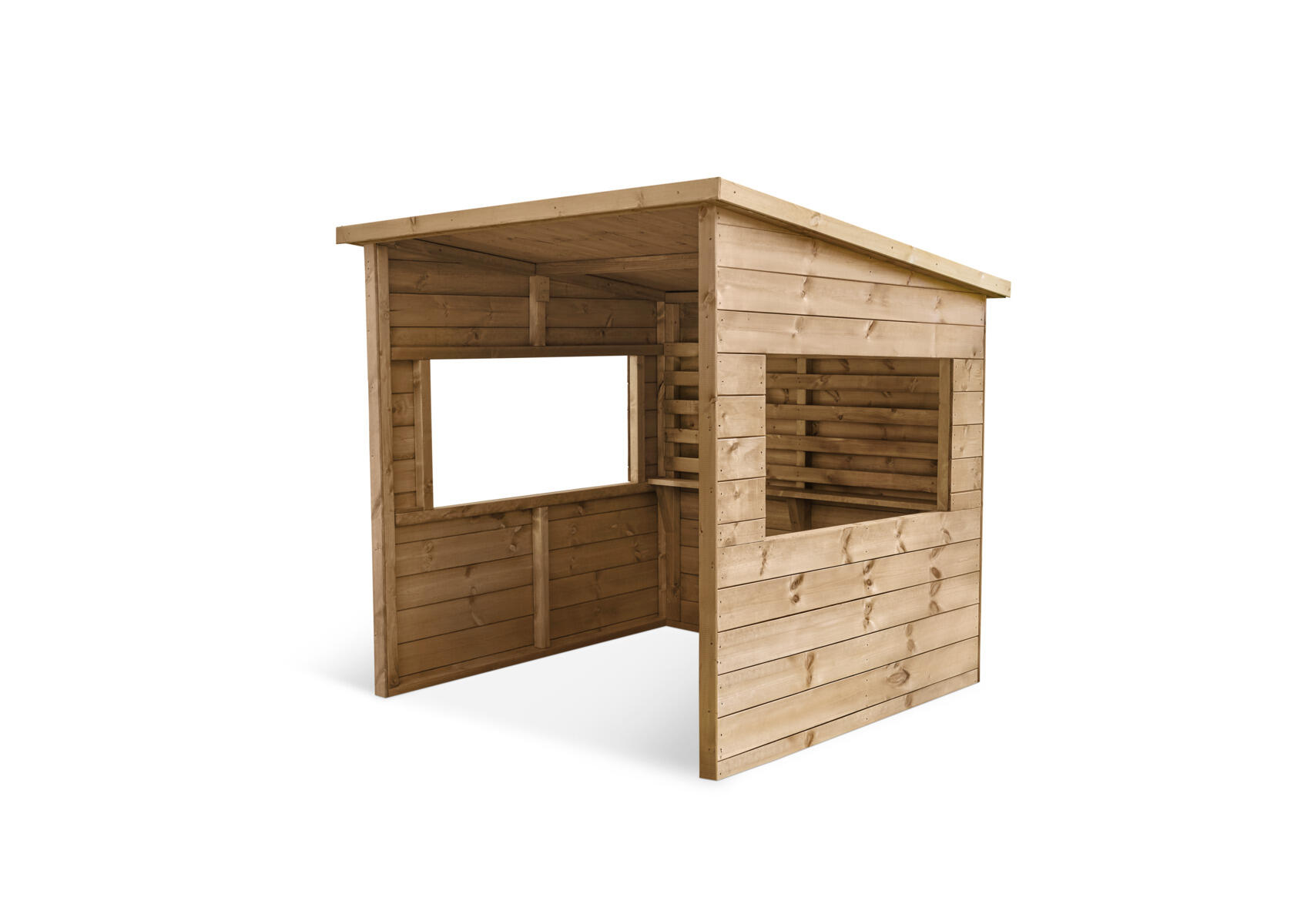 Skapa en inspirerande och lärorik utemiljö på förskolan med detta mångsidiga öppna lekhus. Det lilla huset har en öppen design för olika typer av utforskande, rollekar som affär, restaurang eller café som ger stimulans för barnens fantasi och kreativitet. Lekhuset är utrustat med en smal disk, 2 stora fönster och ett bakstycke med möjlighet att hänga upp saker på. Med en sida som är helt öppen kan både barnen och pedagogerna att ha överblick över vad som händer på gården. Av FSC-certifierad furu som är ytbehandlad med en vattenbaserad lack. Lösning för förankring säljs separat, för väggförankring behövs 2 st av artnr 151133, eller för markförankring behövs 4 st av 161297. Levereras omonterat.