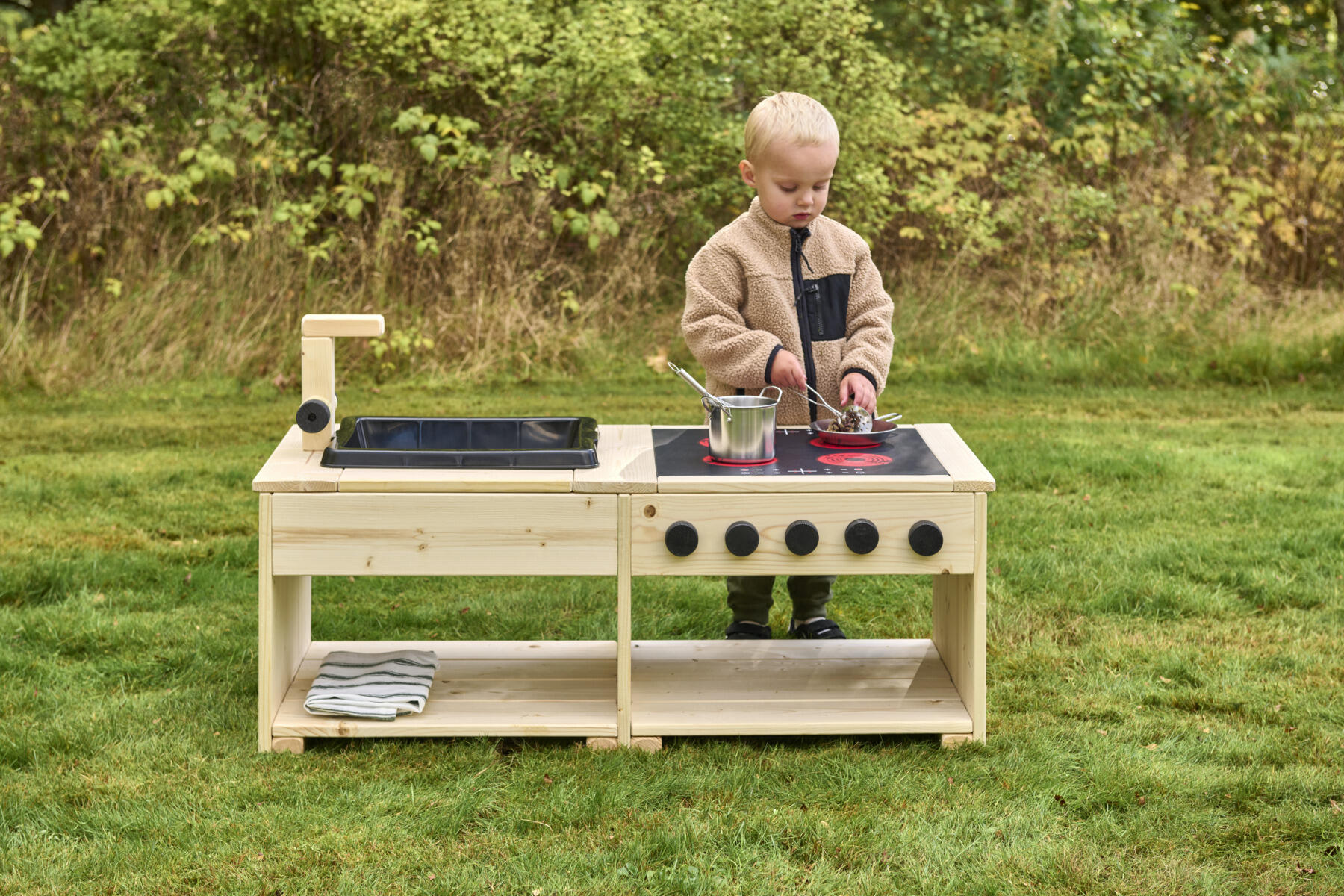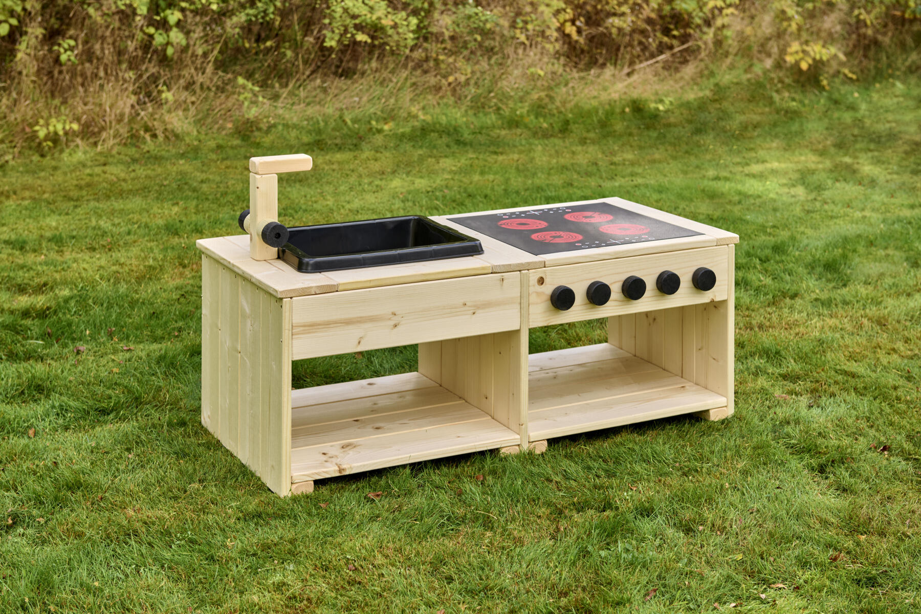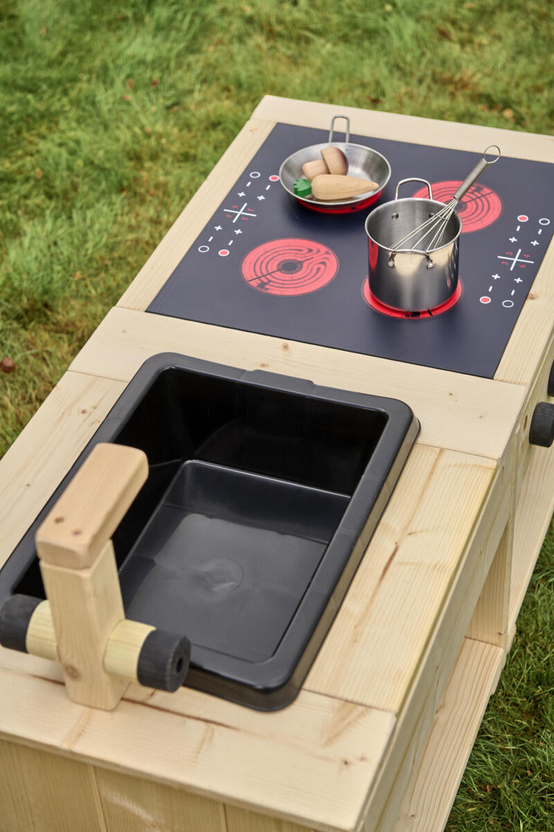 Detta robusta utekök skapar en inspirerande utemiljö för öppen och fantasifull rollek. Här uppmuntras barnen att utforska, blanda och experimentera med kladdig matlagning i sand och vatten. Köksön är utrustad med en rejäl spis med induktionsplatta och vridbara knappar samt en vask med kran. Barnanpassade arbetsytor och öppna hyllor gör det enkelt för barnen att nå material och hålla ordning. Den nedsänkta backen är lätt att lyfta ur för smidig rengöring. Av massiv FSC-märkt furu med marknära delar i slitstarkt robiniaträ för förlängd livslängd på produkten. Köksön finns i både oljad och rötskyddsbehandlad variant. Levereras färdigmonterad
