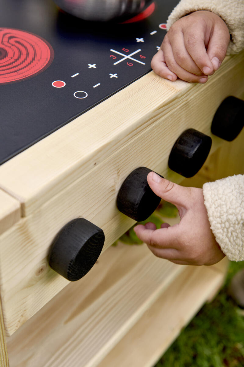 En barnanpassad spis som uppmuntrar till kreativ rollek i förskolans utemiljö. Med induktionsplatta, vridbara knappar och öppna hyllor får barnen en tydlig plats för lek och samspel. Tillverkad i FSC-certifierad furu med slitstarka robiniadetaljer för lång hållbarhet. Finns i oljad eller rötskyddsbehandlad variant. Levereras färdigmonterad