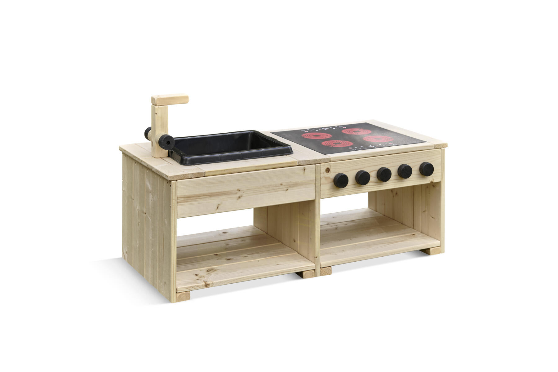 Detta robusta utekök skapar en inspirerande utemiljö för öppen och fantasifull rollek. Här uppmuntras barnen att utforska, blanda och experimentera med kladdig matlagning i sand och vatten. Köksön är utrustad med en rejäl spis med induktionsplatta och vridbara knappar samt en vask med kran. Barnanpassade arbetsytor och öppna hyllor gör det enkelt för barnen att nå material och hålla ordning. Den nedsänkta backen är lätt att lyfta ur för smidig rengöring. Av massiv furu med marknära delar i slitstarkt robiniaträ för förlängd livslängd på produkten. Köksön finns i både oljad och rötskyddsbehandlad variant. Levereras färdigmonterad