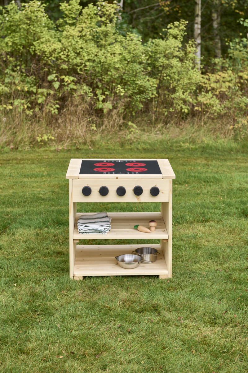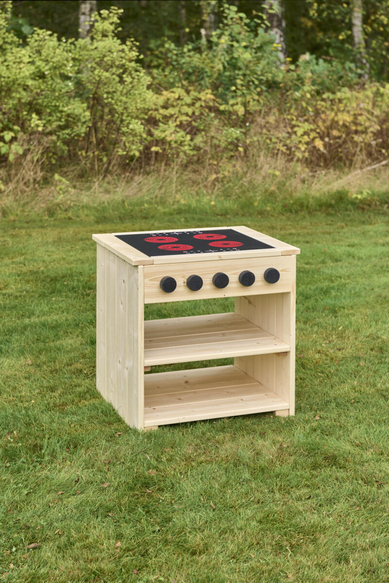En barnanpassad spis som uppmuntrar till kreativ rollek i förskolans utemiljö. Med induktionsplatta, vridbara knappar och öppna hyllor får barnen en tydlig plats för lek och samspel. Tillverkad i FSC-certifierad furu med slitstarka robiniadetaljer för lång hållbarhet. Finns i oljad eller rötskyddsbehandlad variant. Levereras färdigmonterad
