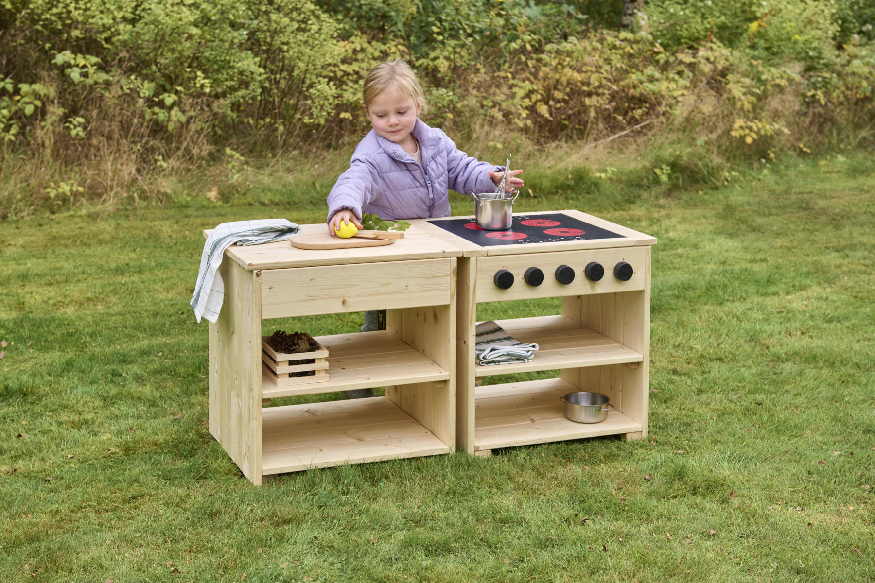 Detta robusta utekök skapar en inspirerande utemiljö för öppen och fantasifull rollek. Här uppmuntras barnen att utforska, blanda och experimentera med kladdig matlagning i sand och vatten. Köksön är utrustad med en rejäl spis med induktionsplatta och vridbara knappar samt en vask med kran. Barnanpassade arbetsytor och öppna hyllor gör det enkelt för barnen att nå material och hålla ordning. Den nedsänkta backen är lätt att lyfta ur för smidig rengöring. Av massiv FSC-märkt furu med marknära delar i slitstarkt robiniaträ för förlängd livslängd på produkten. Köksön finns i både oljad och rötskyddsbehandlad variant. Levereras färdigmonterad