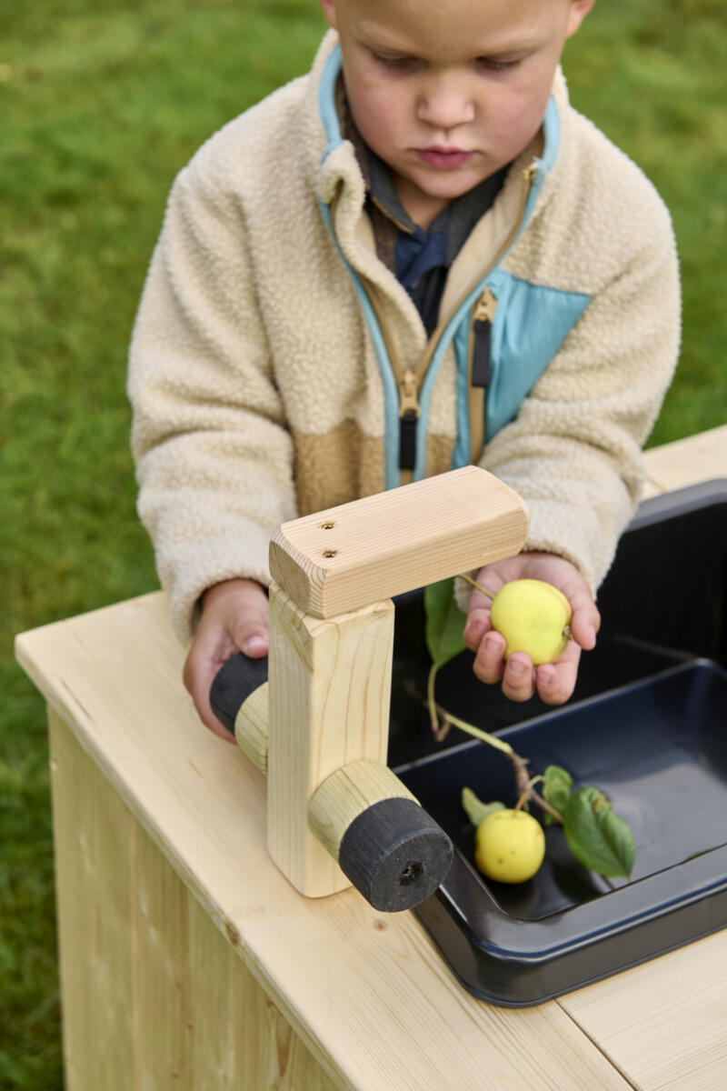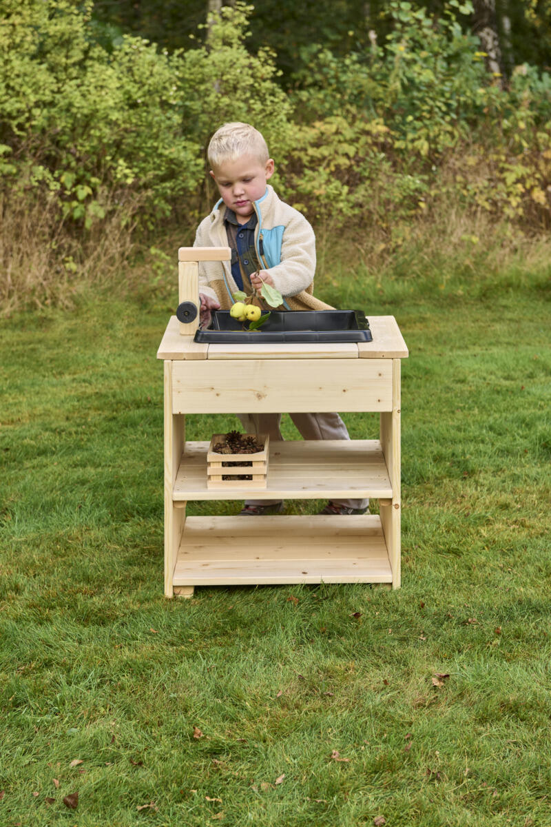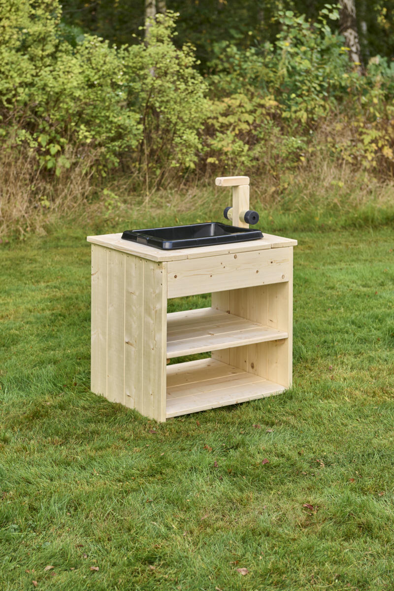 Skapa en inbjudande plats för kreativ och sensorisk rollek i förskolans utemiljö. Denna robusta vask med kran är perfekt för barn som vill experimentera med sand, vatten och kladdig matlagning. De öppna hyllorna gör det enkelt för barnen att själva nå allt de behöver och uppmuntrar både till självständig lek och samspel med andra. Den nedsänkta backen är lätt att lyfta ur, vilket gör rengöringen smidig och snabb. Produkten är tillverkad i FSC-certifierad furu med marknära delar i robiniaträ för förlängd hållbarhet. Välj mellan oljad eller rötskyddsbehandlad variant beroende på behov och miljö. Levereras färdigmonterad