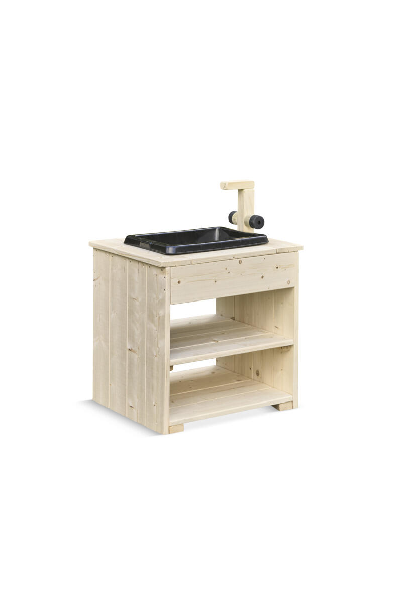 Skapa en inbjudande plats för kreativ och sensorisk rollek i förskolans utemiljö. Denna robusta vask med kran är perfekt för barn som vill experimentera med sand, vatten och kladdig matlagning. De öppna hyllorna gör det enkelt för barnen att själva nå allt de behöver och uppmuntrar både till självständig lek och samspel med andra. Den nedsänkta backen är lätt att lyfta ur, vilket gör rengöringen smidig och snabb. Produkten är tillverkad i med marknära delar i robiniaträ för förlängd hållbarhet. Välj mellan oljad eller rötskyddsbehandlad variant beroende på behov och miljö. Levereras färdigmonterad