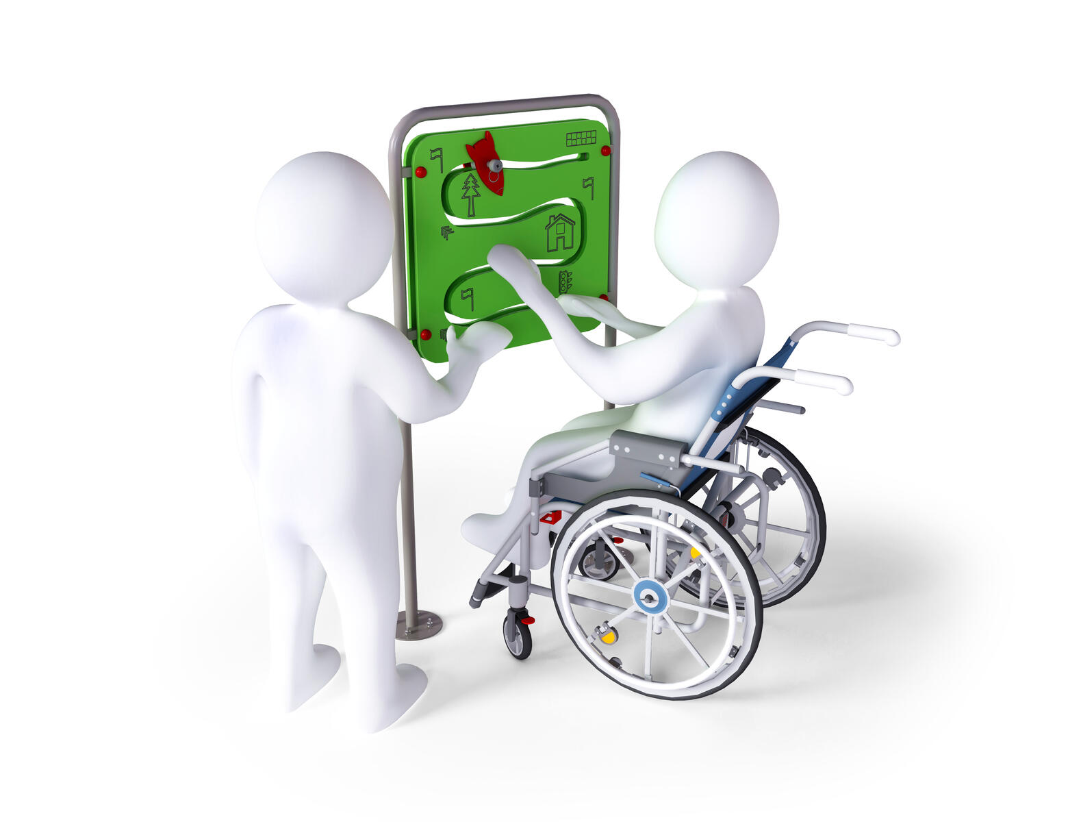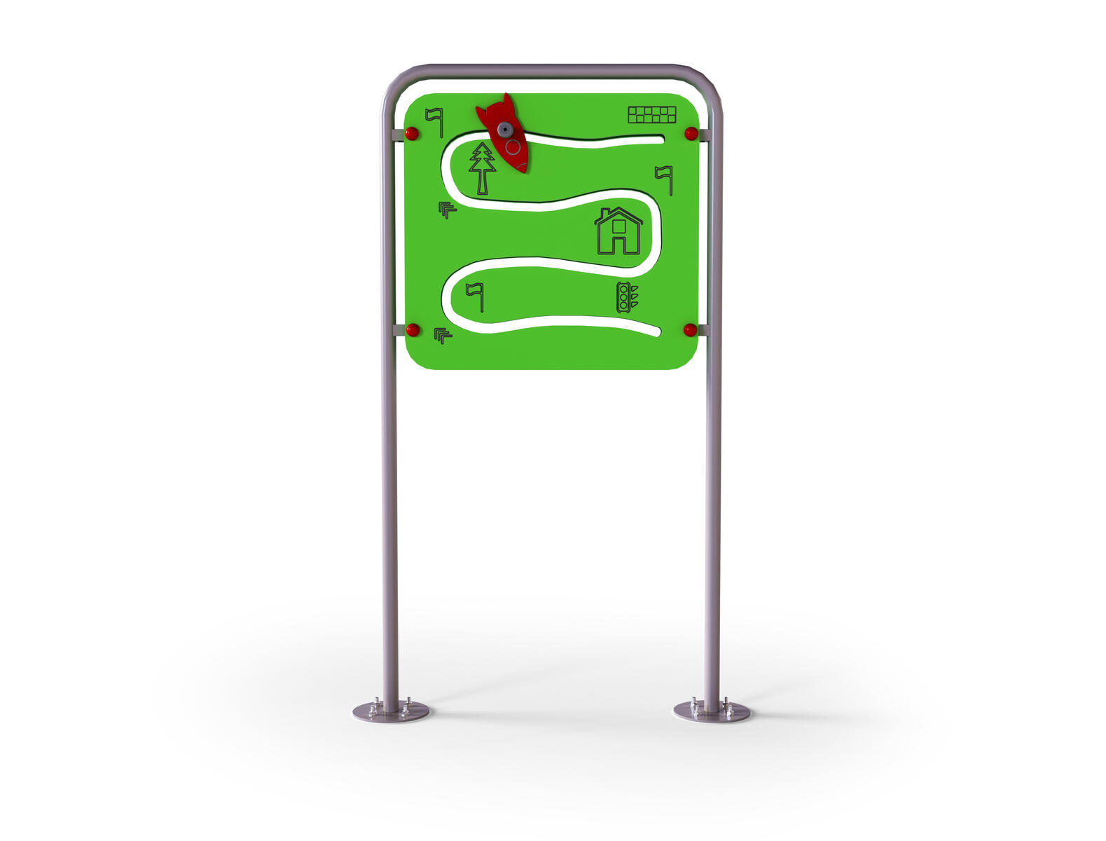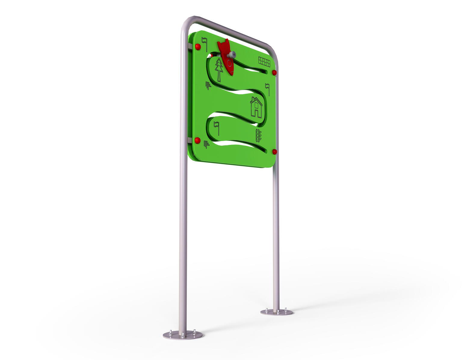 En tillgänglighetsanpassad och lekfull panel där barnen följer den avsedda banan och kan även sätta upp delmål att uppnå längs vägen. Rörelsen tränar öga-handkoordinationen, att bedöma avstånd och att kunna planera sin rörelse. Panelen kan användas av alla och är höjdmässigt även anpassad för en rullstolsburen person. Stålkonstruktion. Färdiga betongfundament medföljer. Monteras enligt installationsmanual.
