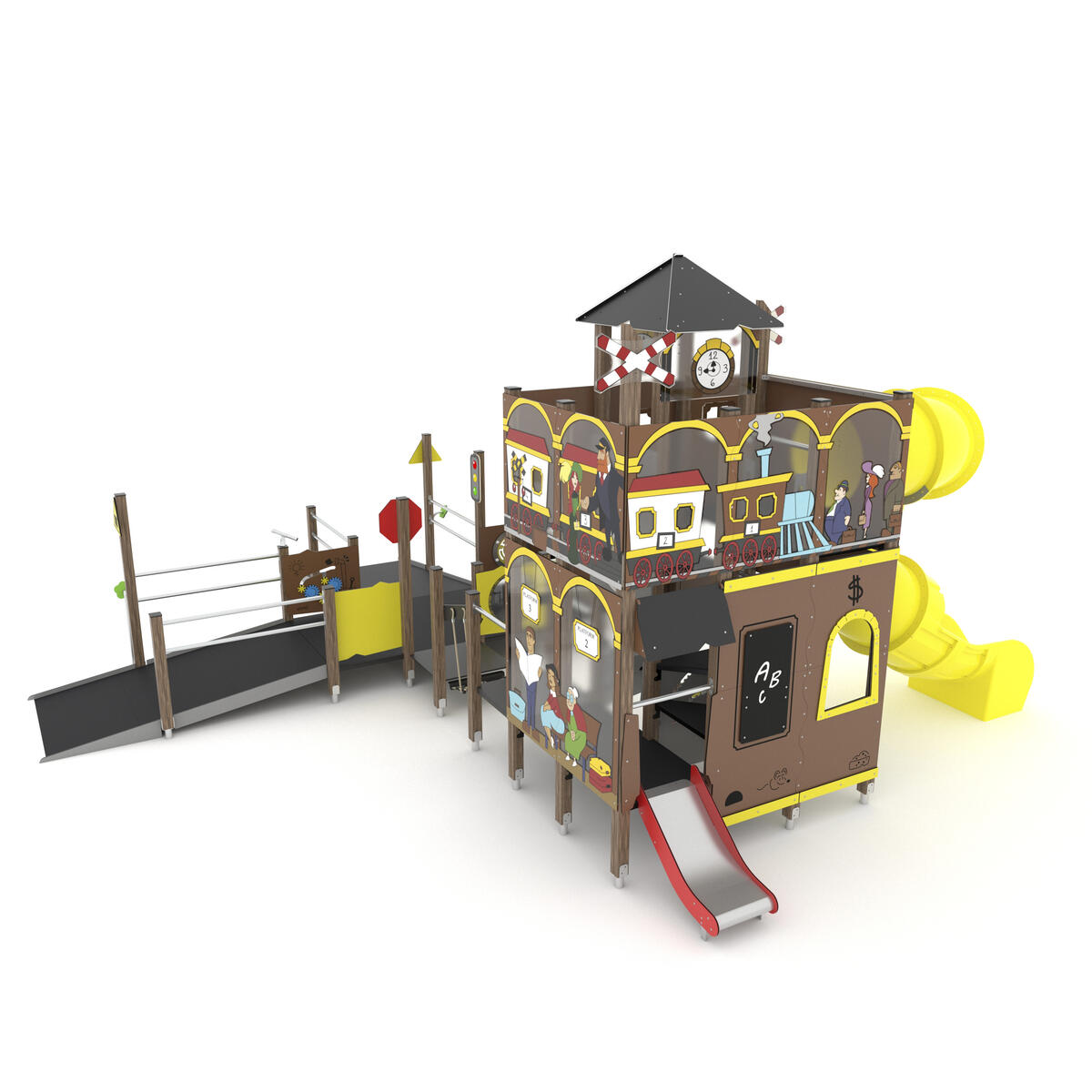 Aktivitetstorn med talande blommor, läspaneler, koordinationspaneler, rutschar och anslutande rullstolsramp. Det går ej att komma in i aktivitetstornet med rullstol. Se produktblad för materialspecifikation. Vid installation ska alltid den medföljande manualen användas. Den senaste versionen finns att tillgå på begäran.