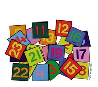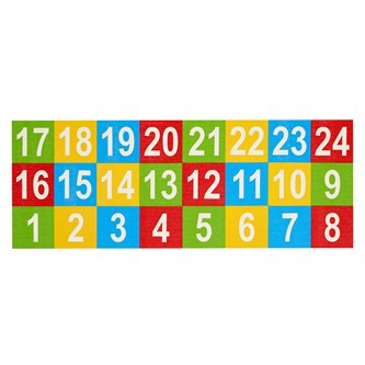 Innehåller 24 numrerade, färgglada, kvadratiska mattbitar i måtten 25x25 cm. För roliga och aktiva mattelekar, t.ex. att hoppa på en speciell siffra eller byta plats. Av 100 % polyester med gummerad undersida. Tvättråd: Mild fintvätt 30 °C. PVC-fri.