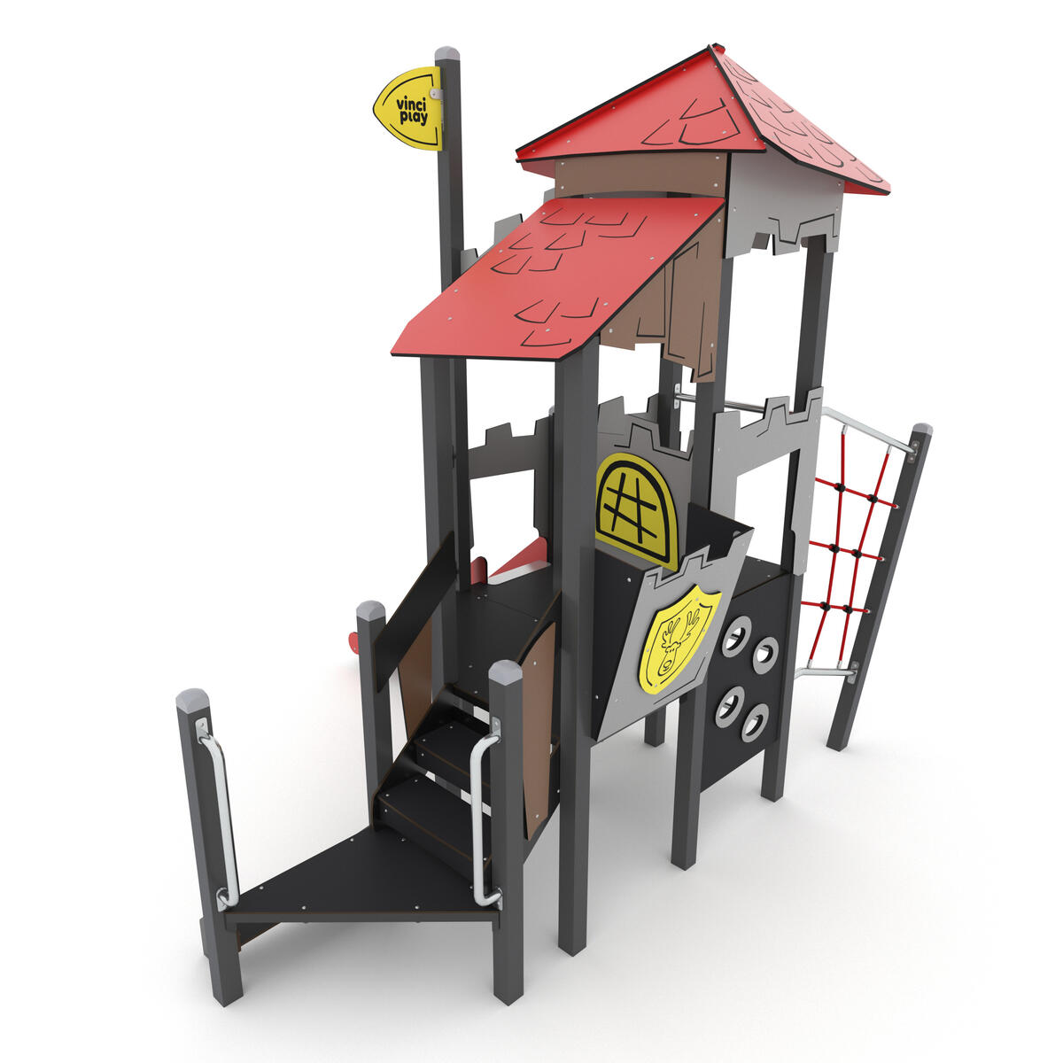Ett högt aktivitetstorn med tre rutschar. I övrigt finns det klätternät, klättervägg, klätterrep, koordinationspaneler, stegar och brandmannastång. Se produktblad för materialspecifikation och övrig info. Vid installation ska alltid den medföljande manualen användas. Den senaste versionen finns att tillgå på begäran.