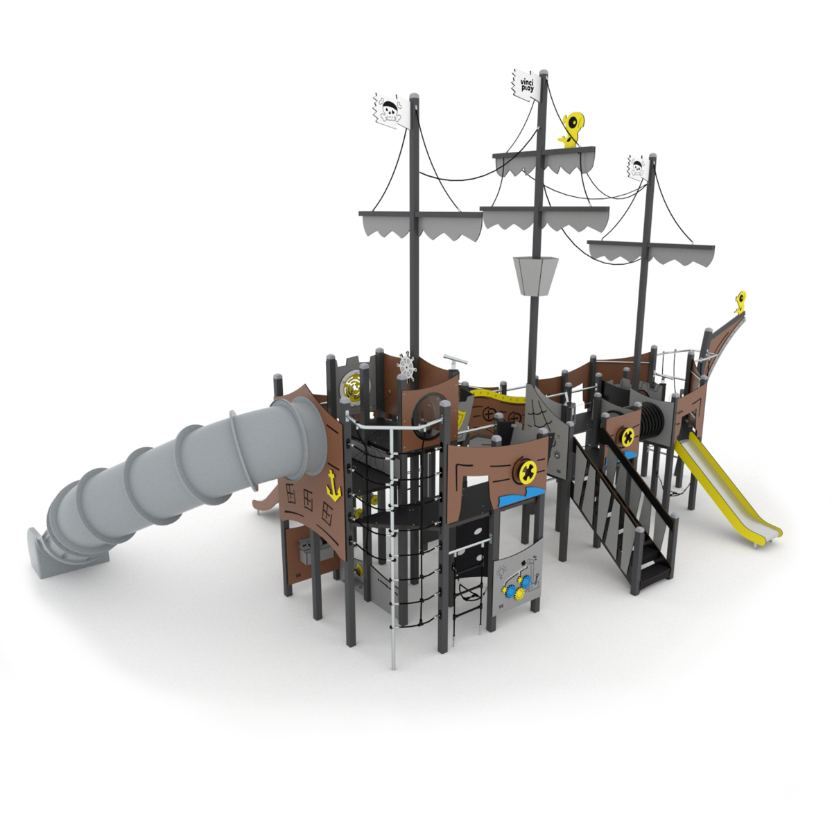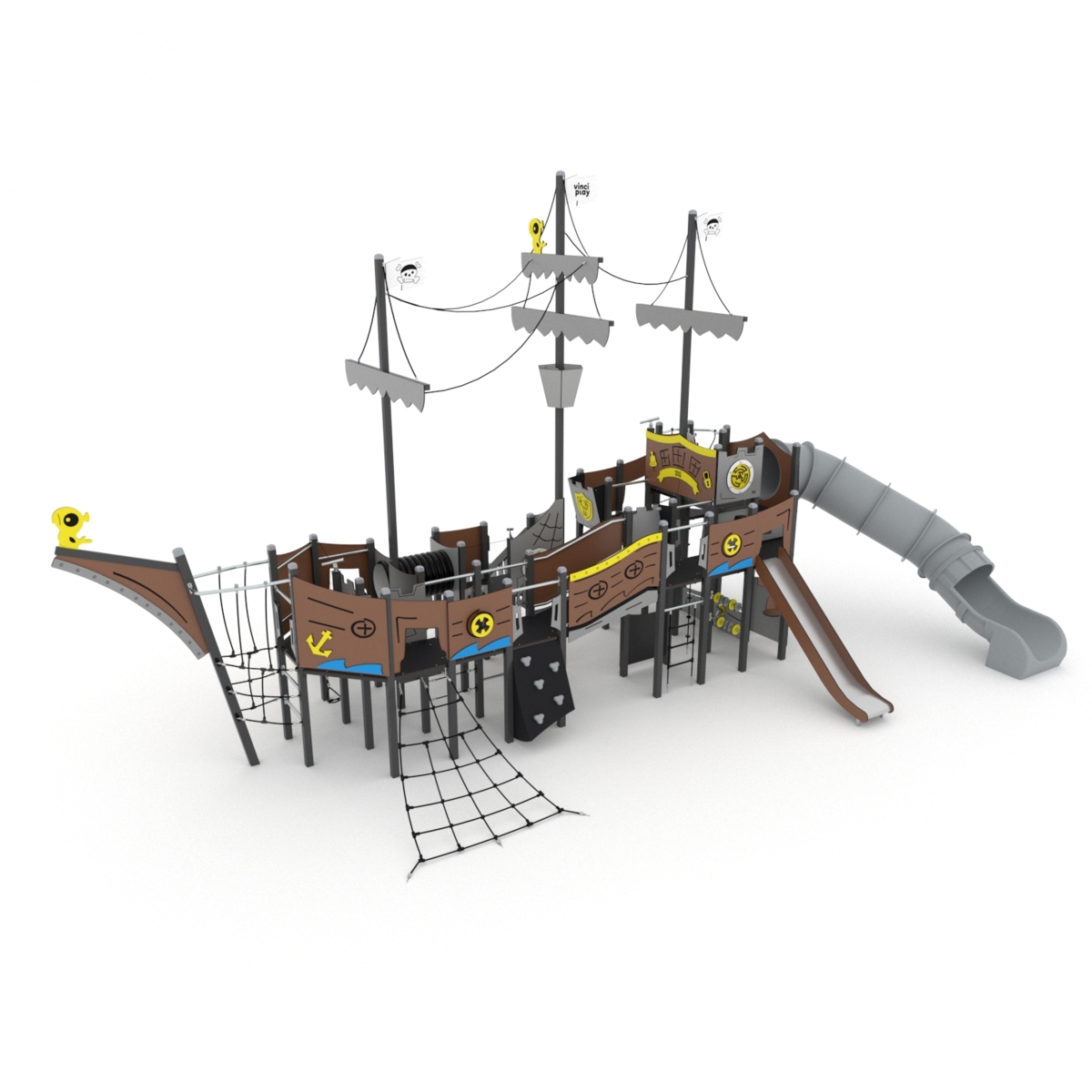 Piratskepp med två rutschar, varav en tubrutsch. Det finns även klätternät, klättervägg, stege koordinationspaneler, kikare och ratt. Se produktblad för materialspecifikation och övrig info. Vid installation ska alltid den medföljande manualen användas. Den senaste versionen finns att tillgå på begäran.