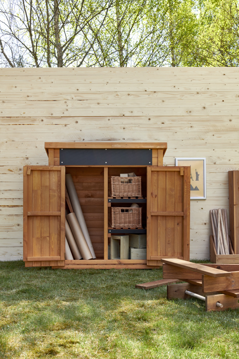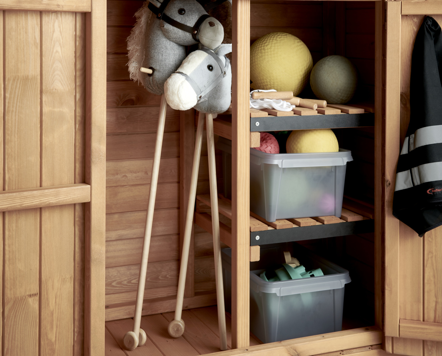 Detta skåp förenklar förvaringen i utemiljön för både barn och pedagoger. Skåpet kan fyllas med material i korgar eller backar och gör materialet mer lättillgängligt på gården. Skåpet är avdelat med 3 hyllplan på ena halvan och plats för stående förvaring som t.ex. innebandyklubbor eller käpphästar på andra halvan. Korgar eller backar ingår ej. Dörrarna är målade med griffelfärg så att barnen kan rita och dekorera. Dörrarna har en hasp på sidan för att kunna stå fullt utfällda under utevistelsen. Skåpet är förberett med ögla för hänglås (ingår ej). Lösning för förankring säljs separat, för väggförankring behövs 2 st av artnr 151133, eller för markförankring behövs 4 st av 151134. Skåpet levereras monterat, endast taket behöver skruvas på. Av FSC-certifierad furu.