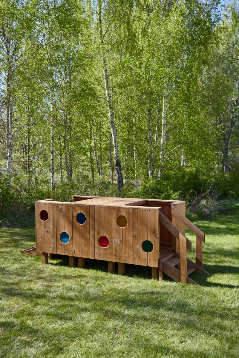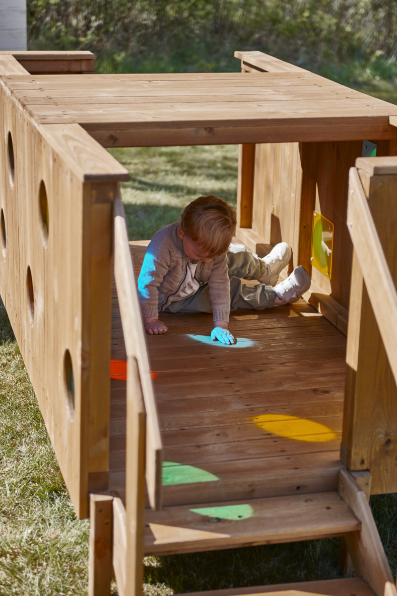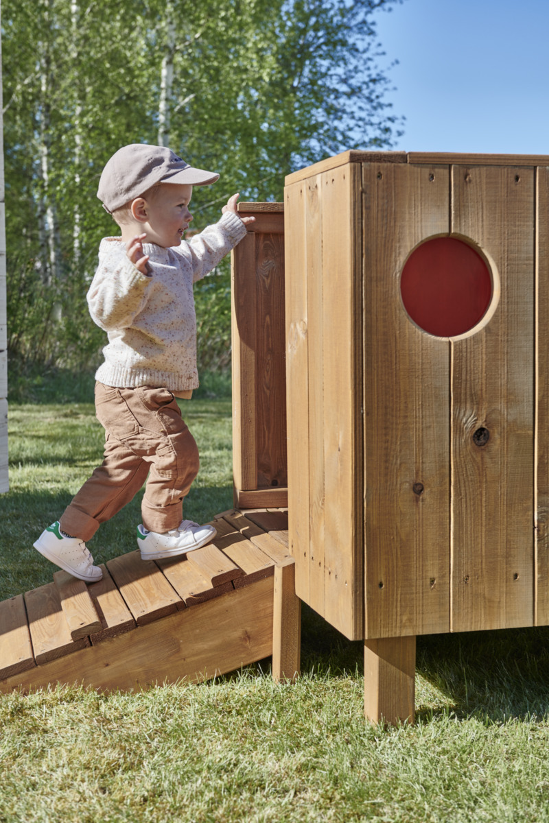 Denna äventyrliga upptäcktsramp erbjuder oändliga timmar av lek i utemiljön som t ex kurragömma, tittut-lek och fantasifulla rollspel. Stimulerar barnen till aktiv och underhållande lek medan de springer runt och utforskar titthålsfönstren. När ljuset bryts genom det färgade plexiglaset skapas fantastiska sensoriska upplevelser som stimulerar det visuella sinnet. Barnen tar sig upp på rampen via en trappa med räcke på ena sidan, eller via en sluttande ramp på motsvarande sida. Tillverkad av FSC-certifierad furu som är ytbehandlad med en vattenbaserad lack. För markförankring behövs 4 st av 161297, eller 151133 för ytmontering. Levereras omonterad.
