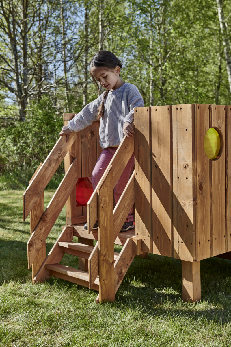 Skapa en inspirerande och lärorik utemiljö på förskolan med detta mångsidiga öppna lekhus. Det lilla huset har en öppen design för olika typer av utforskande, rollekar som affär, restaurang eller café som ger stimulans för barnens fantasi och kreativitet. Lekhuset är utrustat med en smal disk, 2 stora fönster och ett bakstycke med möjlighet att hänga upp saker på. Med en sida som är helt öppen kan både barnen och pedagogerna att ha överblick över vad som händer på gården. Av FSC-certifierad furu som är ytbehandlad med en vattenbaserad lack. Lösning för förankring säljs separat, för väggförankring behövs 2 st av artnr 151133, eller för markförankring behövs 4 st av 161297. Levereras omonterat.