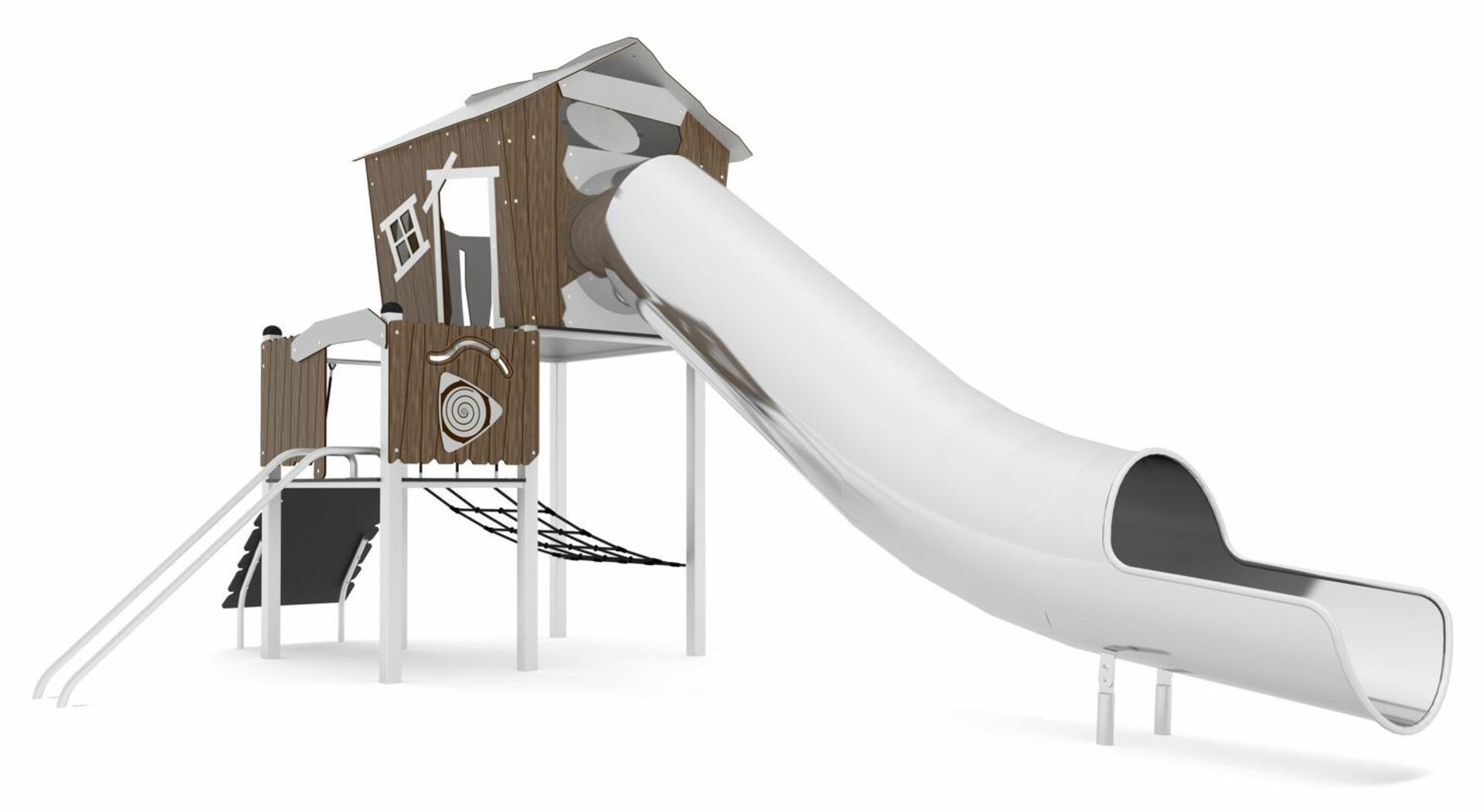 Lekhus med tunnelrutschkana i rostfritt stål, lärpanerler, klättervägg med rep, nätstege, klätternät, takfönster samt HPL-paneler och -plattformar. Ytmontering.