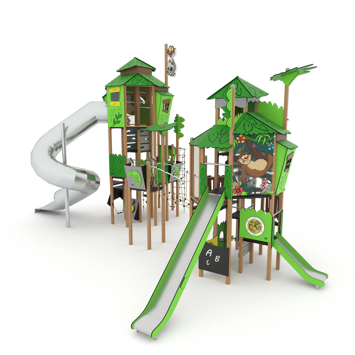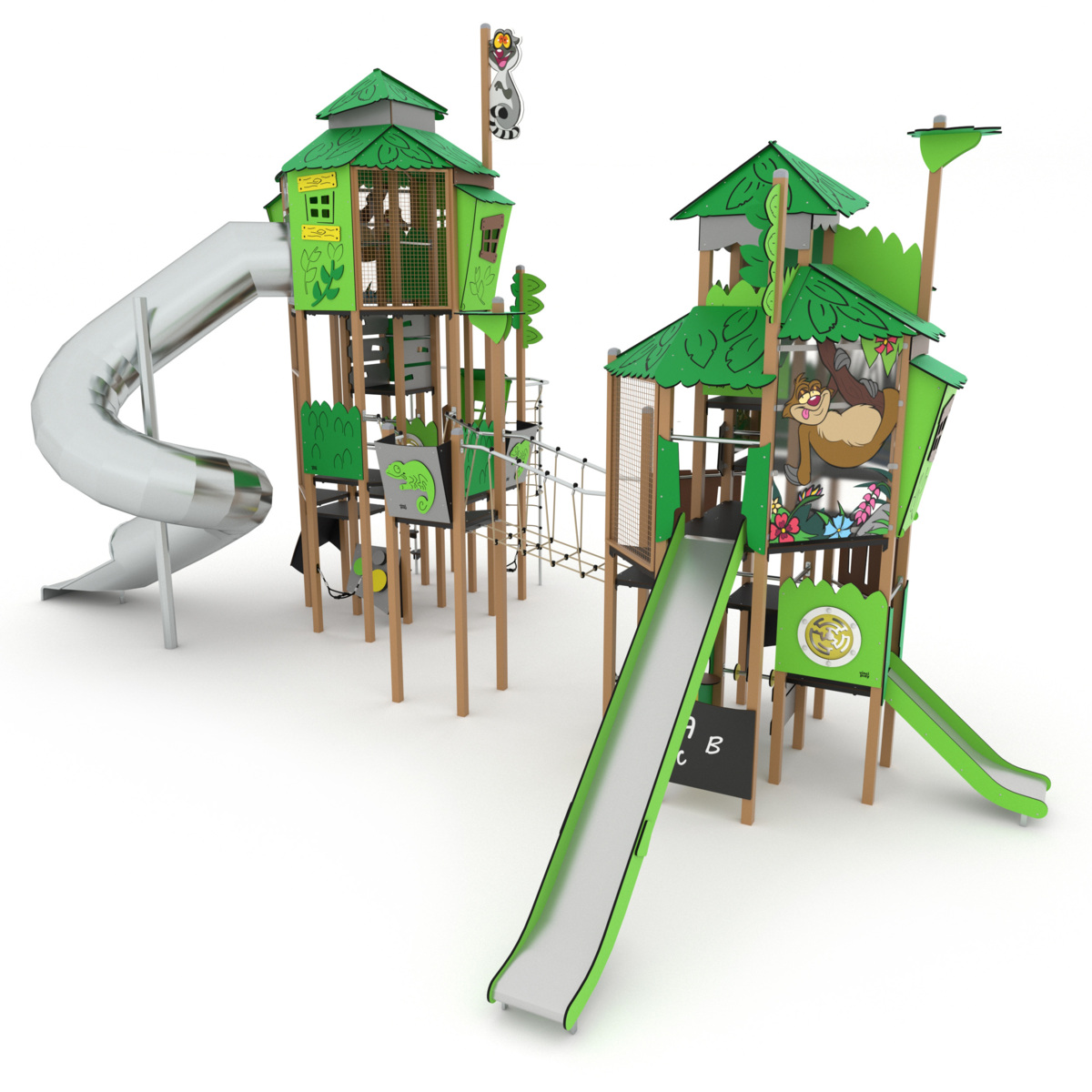 Två aktivitetstorn med tre rutschar. I övrigt finns det klätternät, klättervägg, klätterrep, koordinationspaneler, musikpanel, brandmannastång och en liten gungrem. Se produktblad för materialspecifikation och övrig info. Vid installation ska alltid den medföljande manualen användas. Den senaste versionen finns att tillgå på begäran.