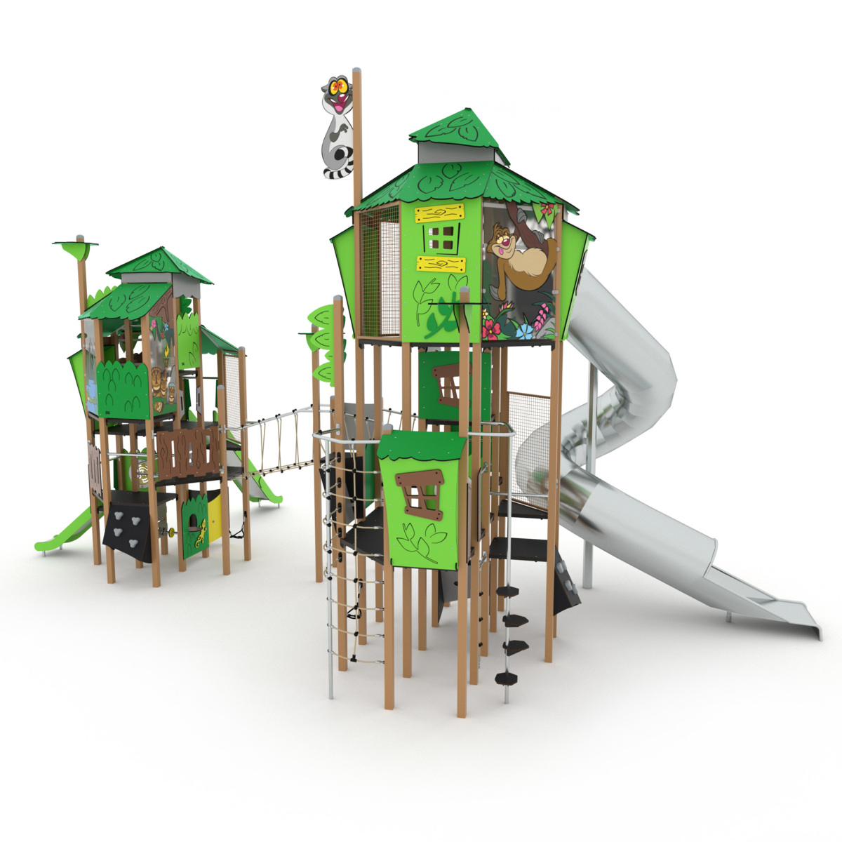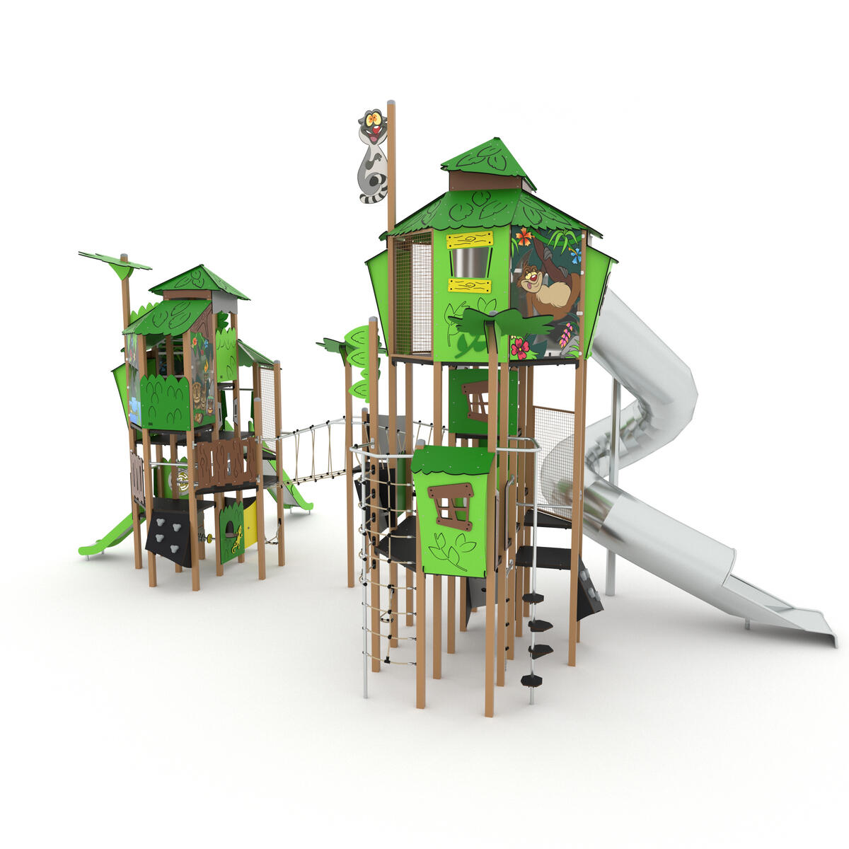 Två höga aktivitetstorn med fem rutschar. I övrigt finns det klätternät, klättervägg, klätterrep, koordinationspaneler, stegar, broar, brandmannastång och en liten gungrem. Se produktblad för materialspecifikation och övrig info. Vid installation ska alltid den medföljande manualen användas. Den senaste versionen finns att tillgå på begäran.