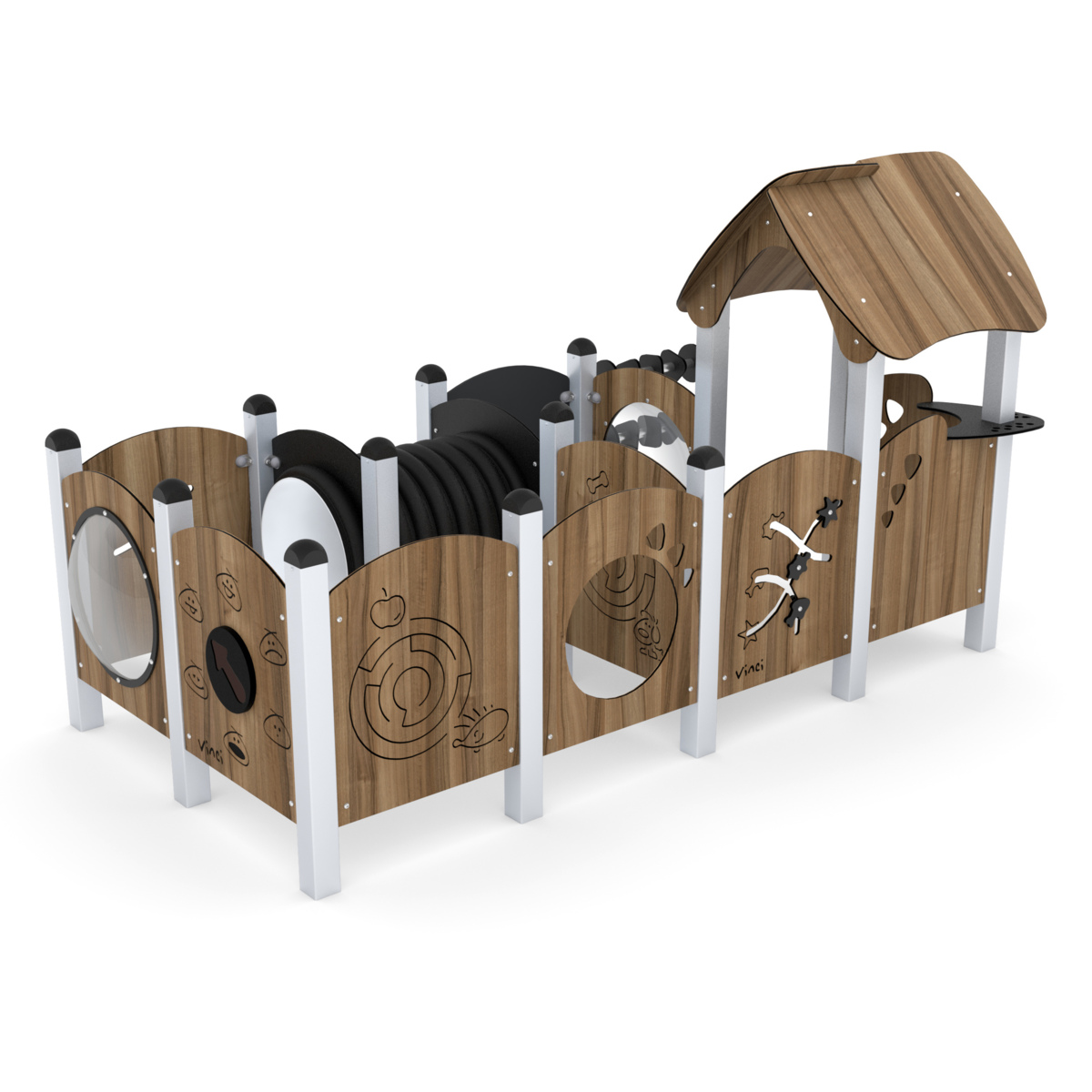 2 lekhus av stål med tunnel och lärpaneler. HDPE-paneler i multifärgad och HPL-paneler i övriga färger. Vid installation ska alltid den medföljande manualen användas. Den senaste versionen finns att tillgå på begäran. Leverantörens artikelnummer Minisweet 0103