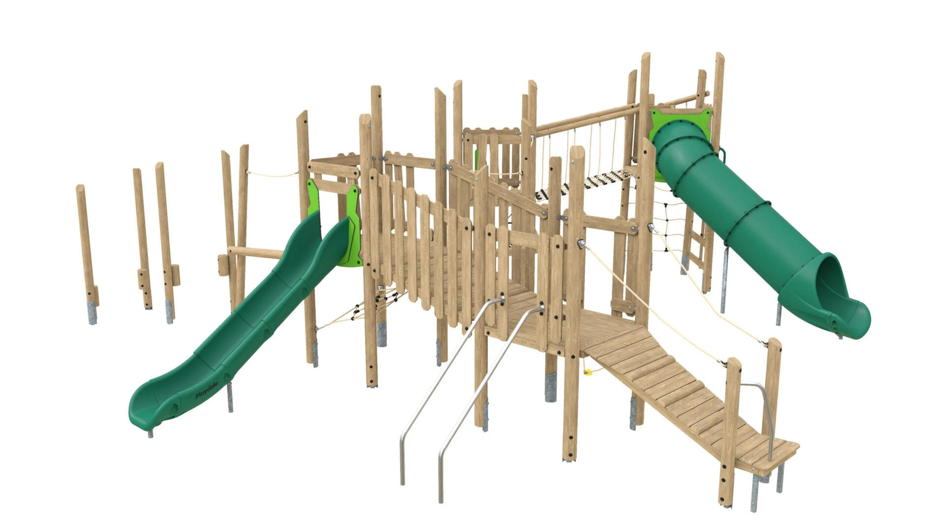 En mångsidig konstruktion som ger barnen en komplett lekupplevelse i harmoni med naturen. De två tornen är utformade för att enkel kunna ta sig upp på flera olika sätt. Lekställningen erbjuder ett stort utbud av varierande klätterlek, rutschkana, balanshinder och sensoriska lekpaneler. Här finns allt för timmar av aktiv och fantasifull lek. Det robusta markfästet i stål håller stolparna av limträ ovan mark och skyddar mot fukt och slitage. Färgalternativ och rutschbana av rostfritt stål finns tillgängligt vid förfrågan. Leverantörens artikelnummer QWDHED005-1