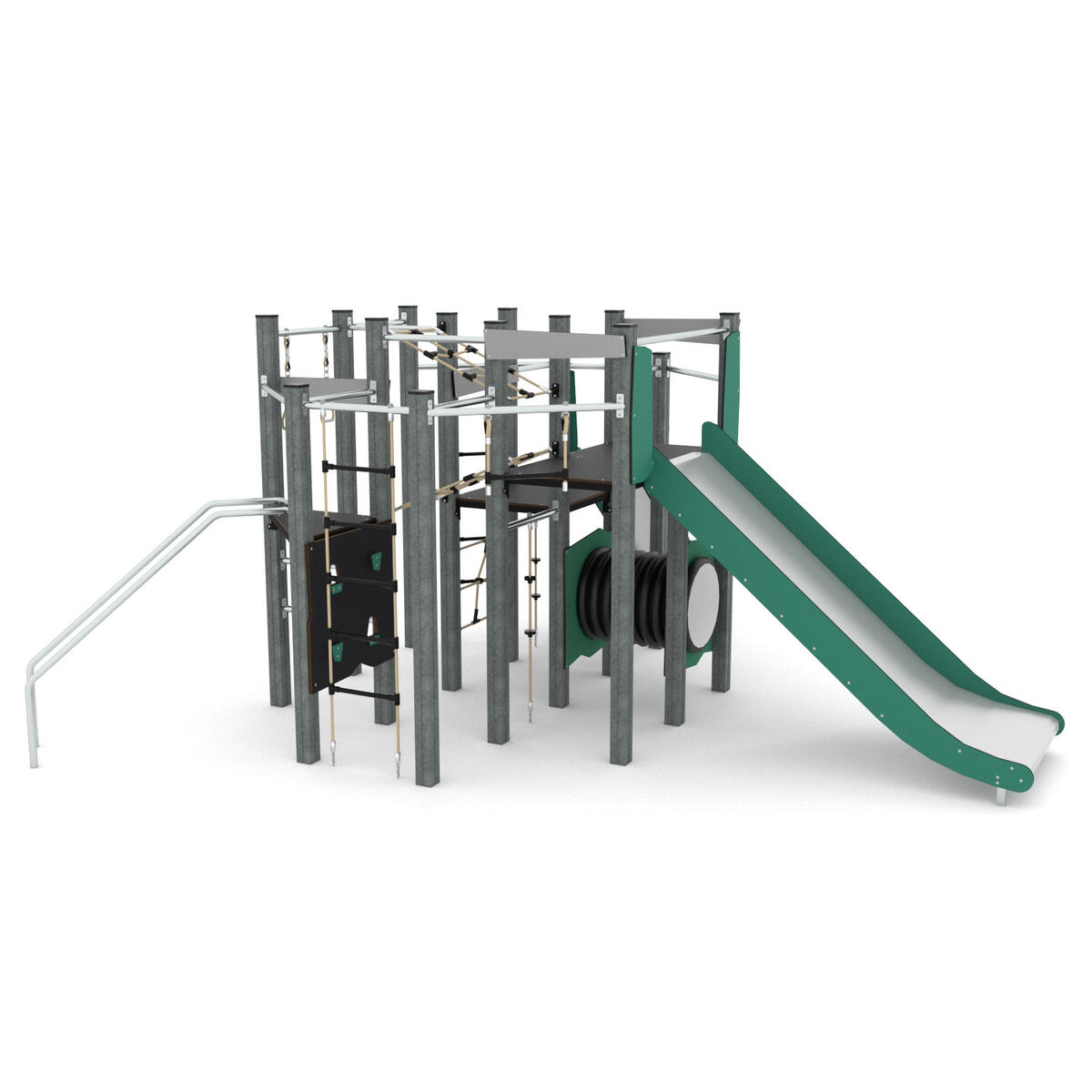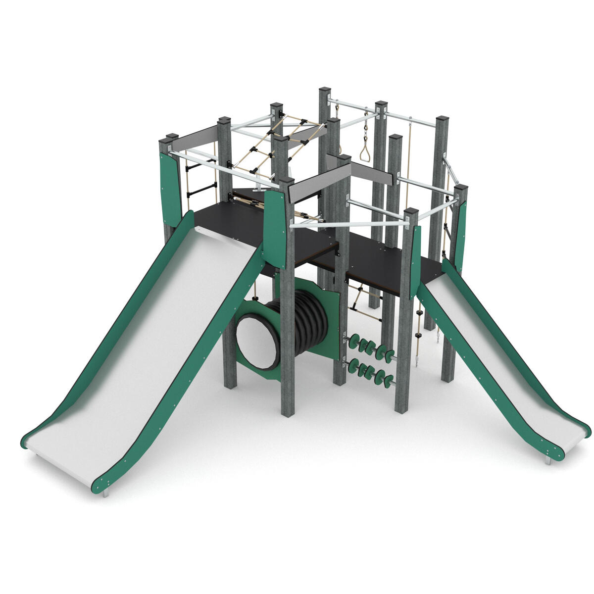 Klätterställning innehållande två torn med rutschkanor, glidstänger, tunnel, klätterrep, nätstege och klättervägg. Denna konstruktion är baserad på 100 % återvunnet material. Alla stolpar är tillverkade av återvunnen textil. Några av många fördelar med detta material är att det inte rostar, inte absorberar vatten, är UV-resistent och ändå är lika hållbart som stål. Kärnan på alla paneler är av återvunna rep och fiskenät. Som en del i den cirkulära ekonomin lägger dessa hållbara och miljövänliga material grunden för framtidens lekplatser med lägre koldioxidutsläpp. Vid installation ska alltid den medföljande manualen användas. Den senaste versionen finns att tillgå på begäran.