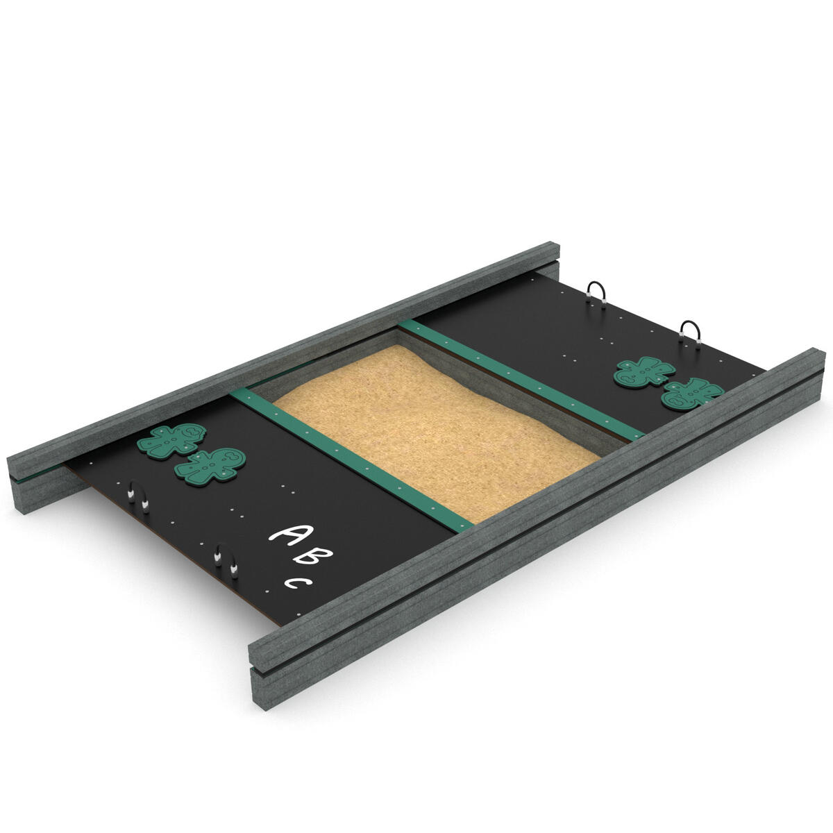 Denna sandlåda med lock är gjort av 100 % återvunnet material. Alla stolpar är tillverkade av återvunnen textil. Några av många fördelar med detta material är att det inte rostar, inte absorberar vatten, är UV-resistent och ändå är lika hållbart som stål. Kärnan på alla paneler är av återvunna rep och fiskenät. Som en del i den cirkulära ekonomin lägger dessa hållbara och miljövänliga material grunden för framtidens lekplatser med lägre koldioxidutsläpp. Vid installation ska alltid den medföljande manualen användas. Den senaste versionen finns att tillgå på begäran.