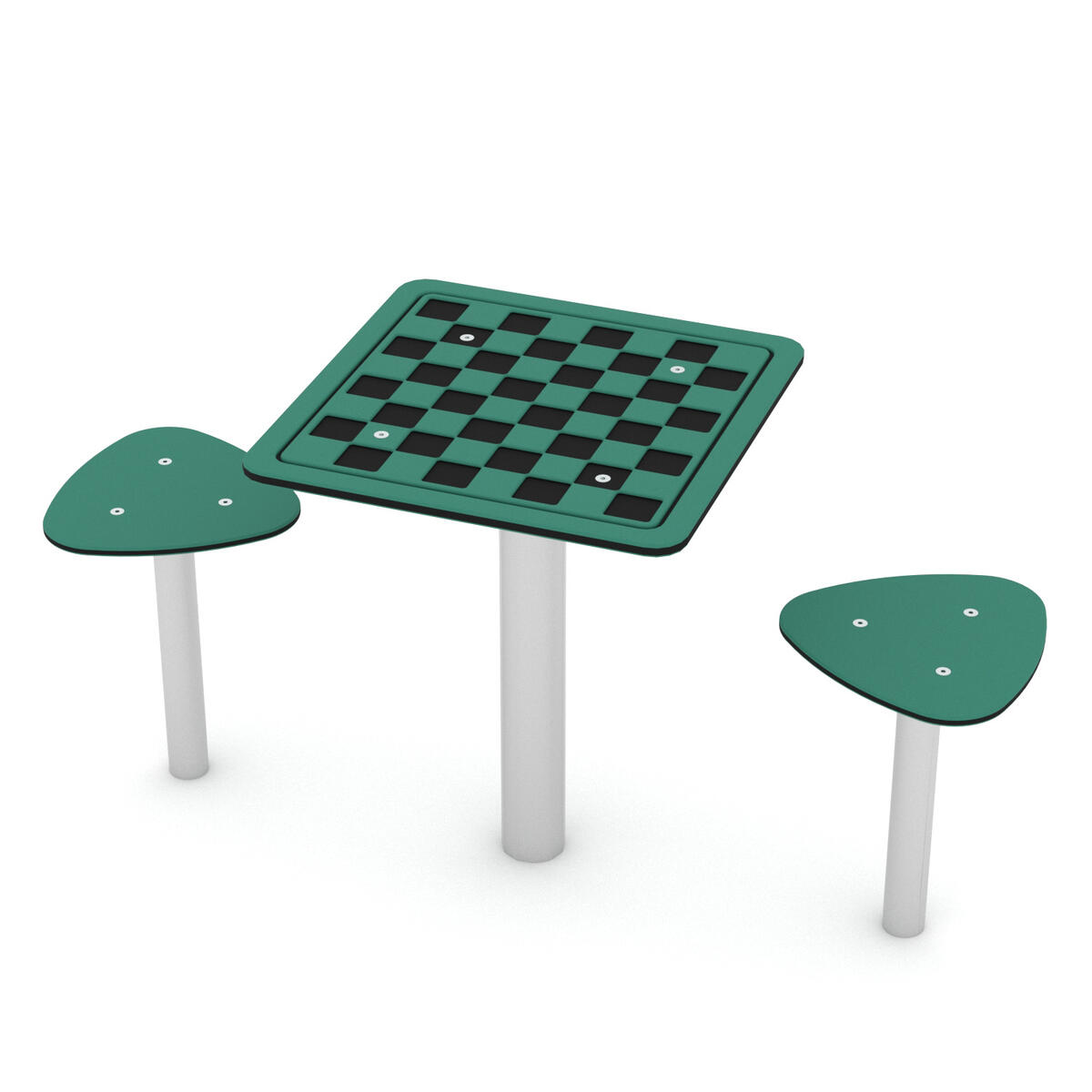 Ett schackbord med två tilhörande pallar. Kärnan på alla paneler är av återvunna rep och fiskenät. Som en del i den cirkulära ekonomin lägger dessa hållbara och miljövänliga material grunden för framtidens lekplatser med lägre koldioxidutsläpp. Vid installation ska alltid den medföljande manualen användas. Den senaste versionen finns att tillgå på begäran.