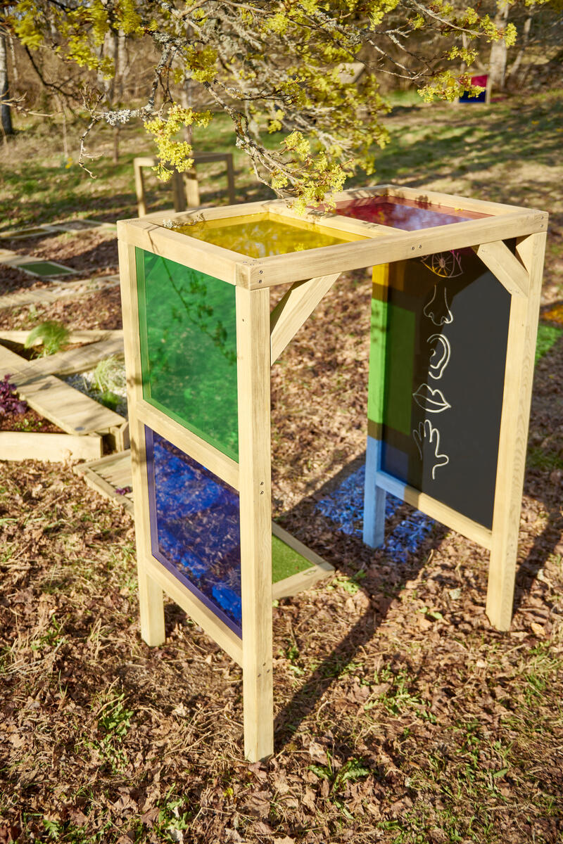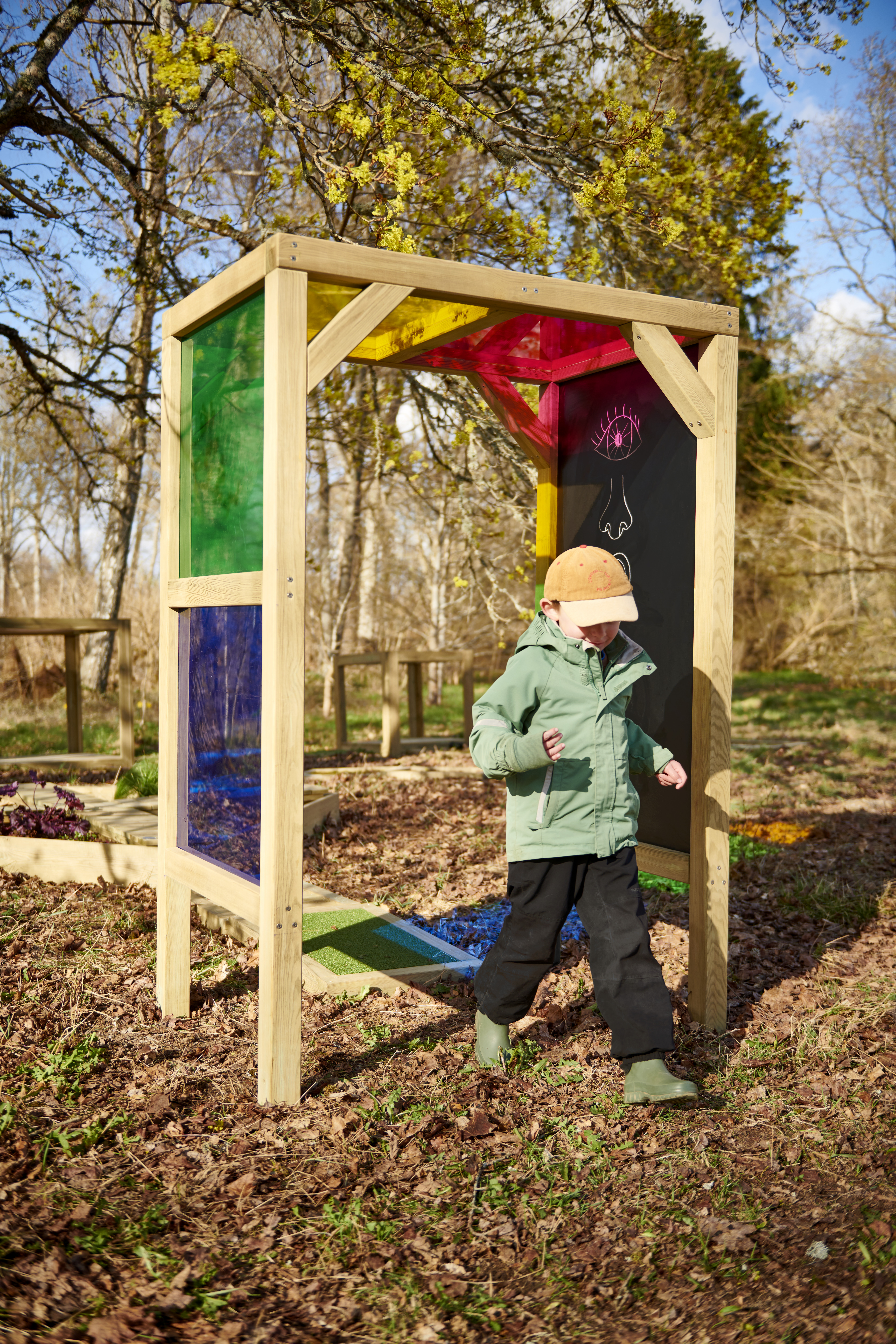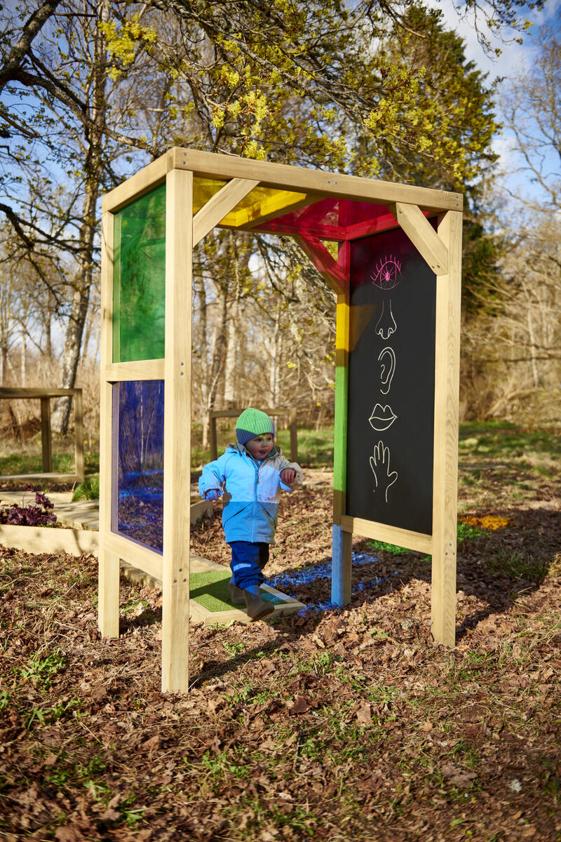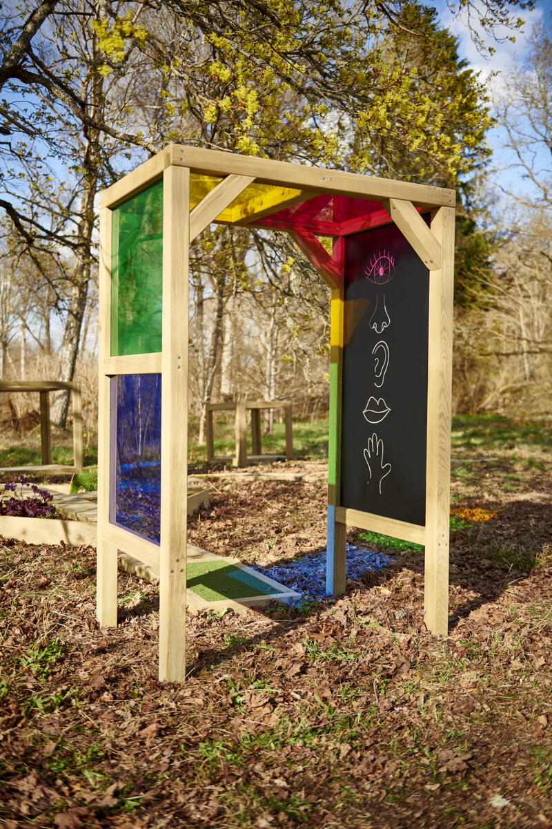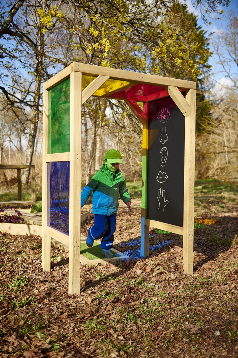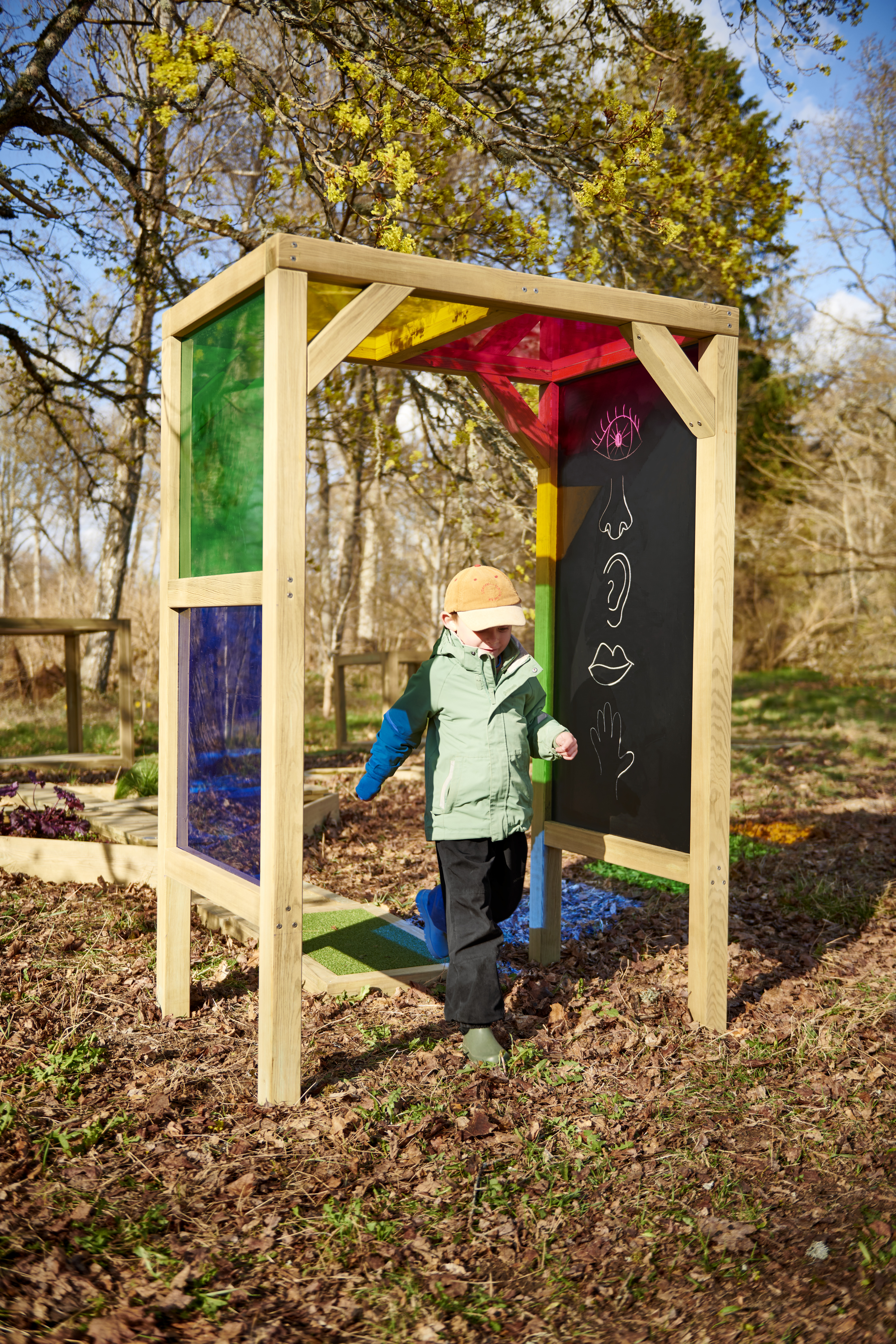Skapa en sensorisk utemiljö som uppmuntrar till att utforska, känna, lukta, röra och som stimulerar de fem olika sinnena. Denna mångsidiga sinnegård bidrar med både form och funktion på gården och skapar en fin inramning i miljön. En inbjudande och lugn zon där man kan växla mellan olika aktiviteter, tex plantera i ramarna, eller välja att fylla ramarna med olika material och texturer som till exempel bark, kottar, sand, sten och använda dem som sensoriska lådor. Att uppleva med sina sinnen förstärks i utemiljön och där löst naturmaterial stimulerar ett undersökande arbetssätt. Spången uppmuntrar till rörelse mellan ramarna och man kan enkelt förflytta sig och nå alla delar.