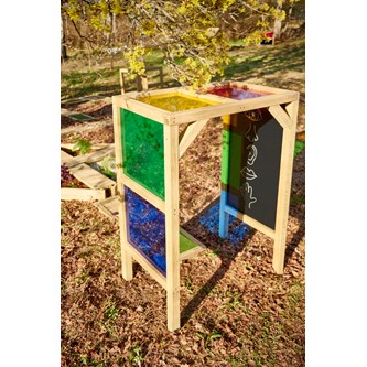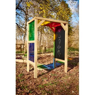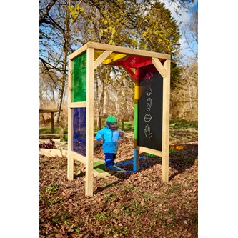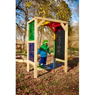 Att gå igenom en portal kan upplevas som lite magiskt och skapar en förstärkt rumslighet i utemiljön. När ljuset bryts igenom det färgade plexiglaset skapas fantastiska sensoriska upplevelser som stimulerar det visuella sinnet. Portalen kan hjälpa till att förtydliga utemiljön och skapa förståelse för vad som förväntas inom olika zoner. En griffeltavla på ena sidan kan hjälpa till att förstärka budskapet, eller användas i skapandet. Rejäla fönster av plexiglas på 12 mm. Levereras färdigmonterat. Lösning för nedgrävd markförankring medföljer.