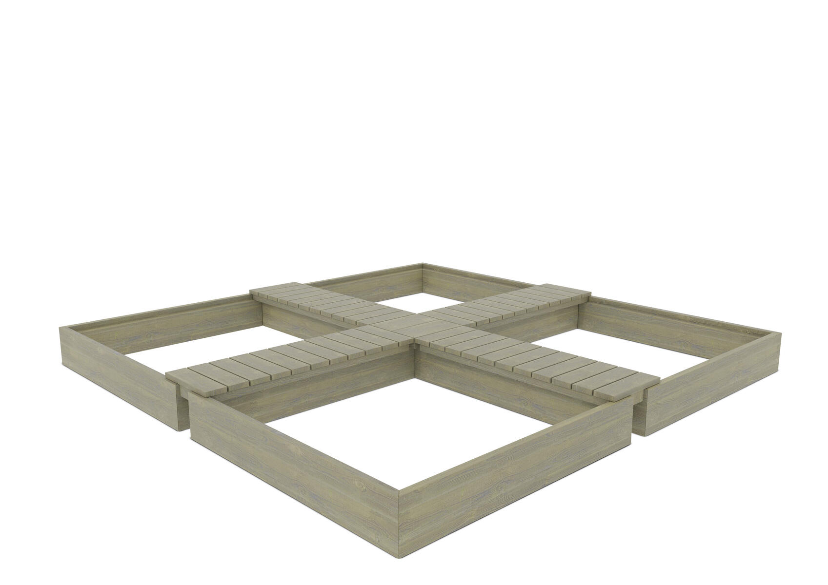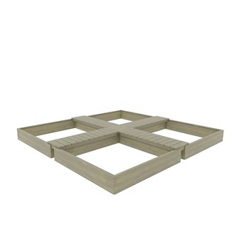 Skapa en sensorisk utemiljö som uppmuntrar till att utforska, känna, lukta, röra och som stimulerar de fem olika sinnena. Denna mångsidiga sinnegård bidrar med både form och funktion på gården och skapar en fin inramning i miljön. En inbjudande och lugn zon där man kan växla mellan olika aktiviteter, tex plantera i ramarna, eller välja att fylla ramarna med olika material och texturer som till exempel bark, kottar, sand, sten och använda dem som sensoriska lådor. Att uppleva med sina sinnen förstärks i utemiljön och där löst naturmaterial stimulerar ett undersökande arbetssätt. Spången uppmuntrar till rörelse mellan ramarna och man kan enkelt förflytta sig och nå alla delar.