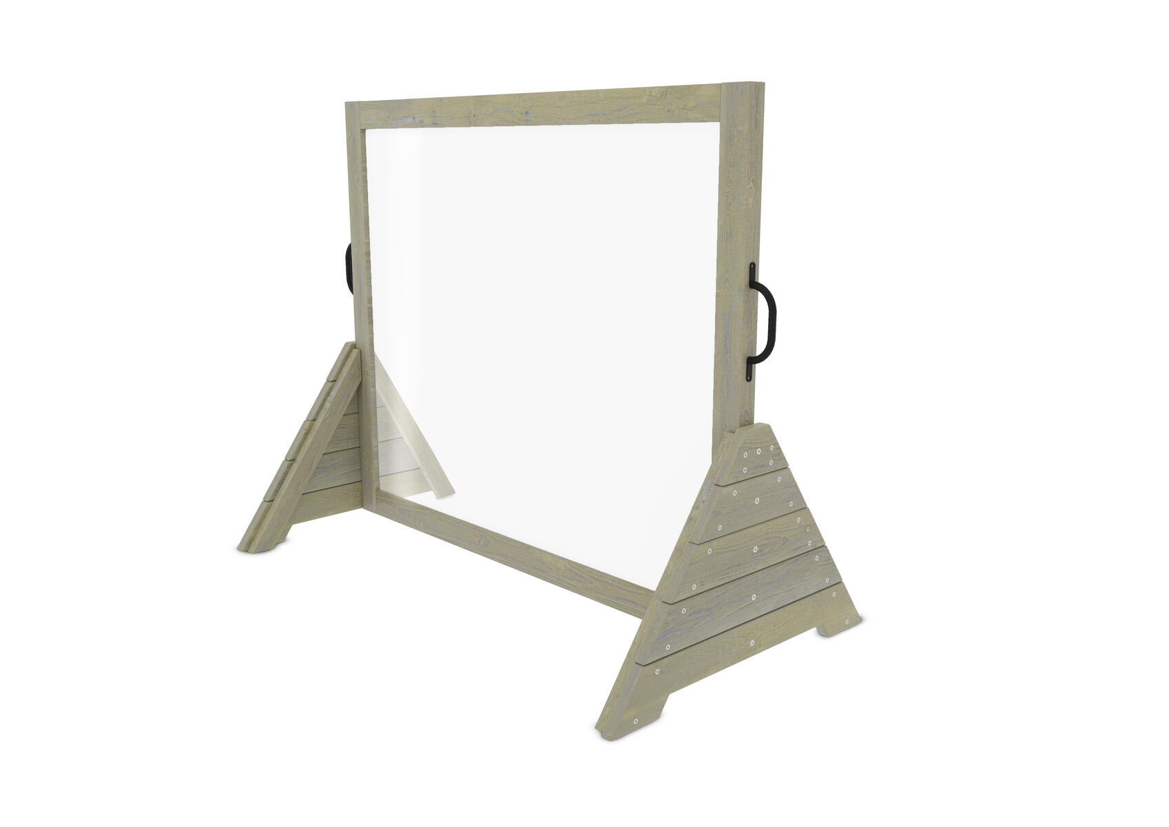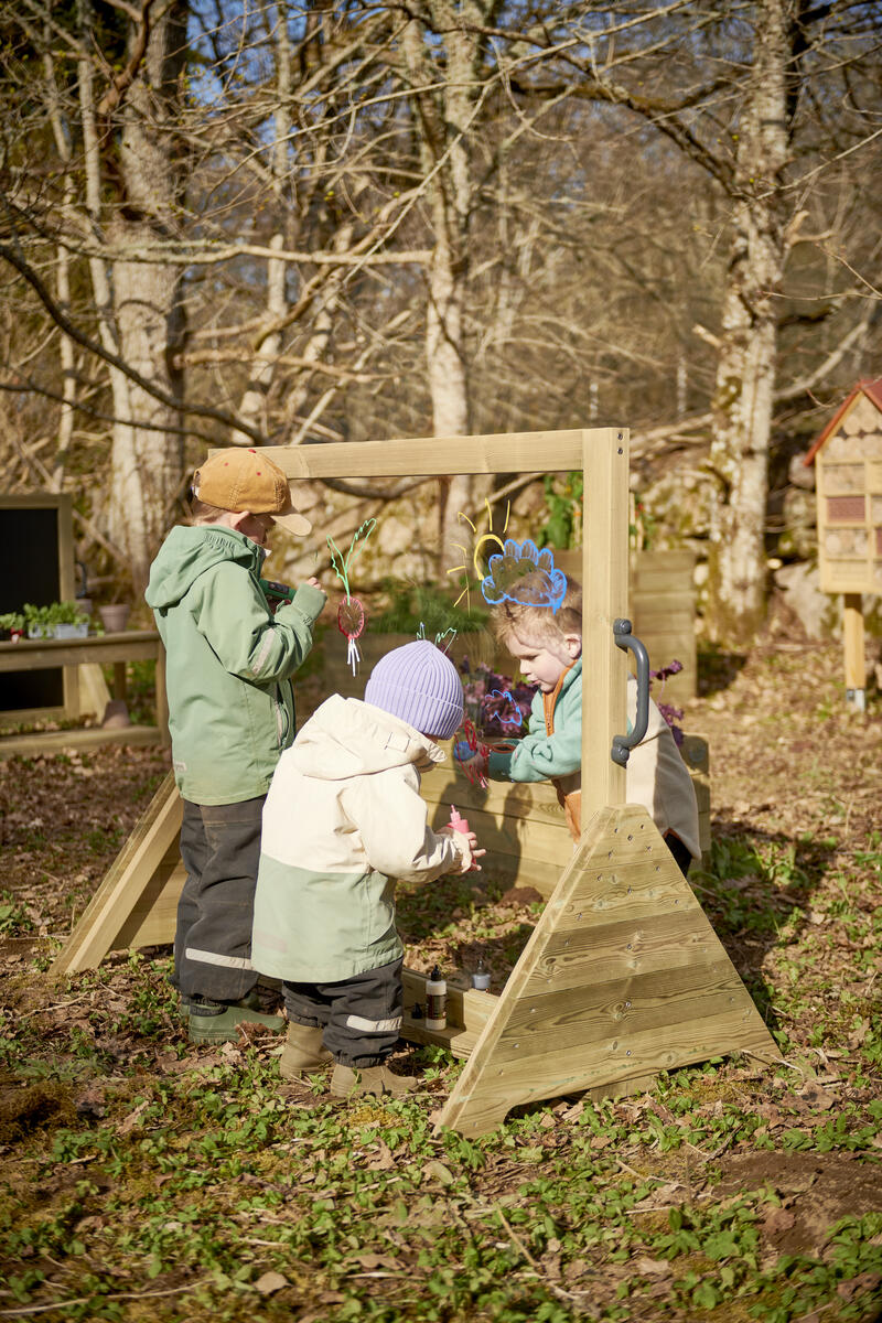 Ett rejält staffli med en stor arbetsyta som ger förutsättningar till skapande utomhus. Staffliet kan placeras så att det förstärker rumslighet i utemiljön och fungera som en avskärmning. Staffliet har en stadig bas och är utrustat med rejäla handtag på sidorna som underlättar vid förflyttning. Det går att måla direkt på plexiglaset med avtvättningsbar färg eller kritpennor. Robusta fönster av plexiglas på 12 mm. Levereras färdigmonterat.