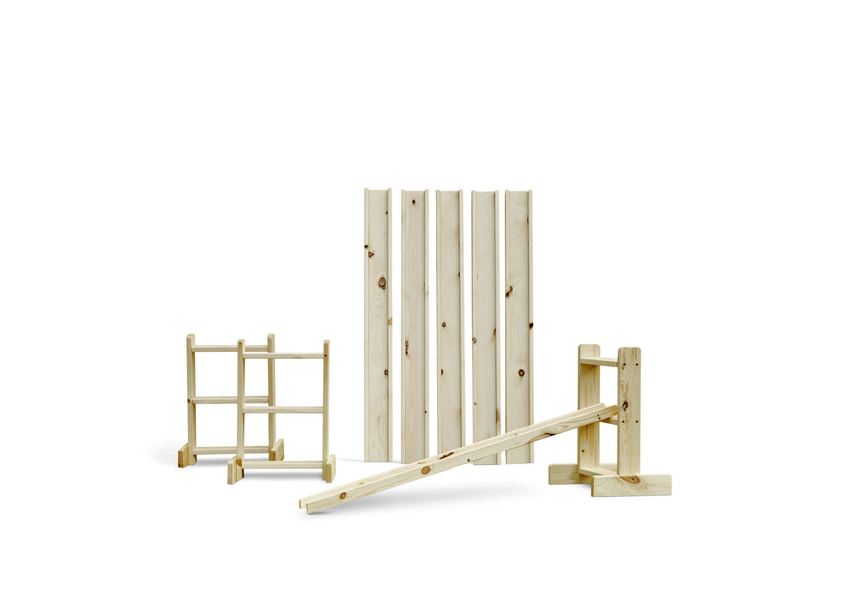 En öppen och mångsidig produkt för utemiljön där banor kan förvandlas till vägar, ramper, kulbanor och mycket mer. De 3 stativen har olika höjdindelningar, vilket gör det möjligt att experimentera med olika lutningar på banorna för jämförande och utforskande. Genom praktisk lek kan barnen få en grundläggande förståelse inom gravitation, rörelse och teknik. Denna produkt är perfekt för att väcka nyfikenhet kring orsak och verkan samt för att träna problemlösningsförmågan. Både banor och stativ är tillräckligt lätta för att barnen ska kunna bära och justera och underlättar för ett självständigt utforskande. Setet innehåller 6 banor och 3 stativ. Tillverkade av FSC-certifierat furu som är behandlat med linolja. Tas in när den inte används.