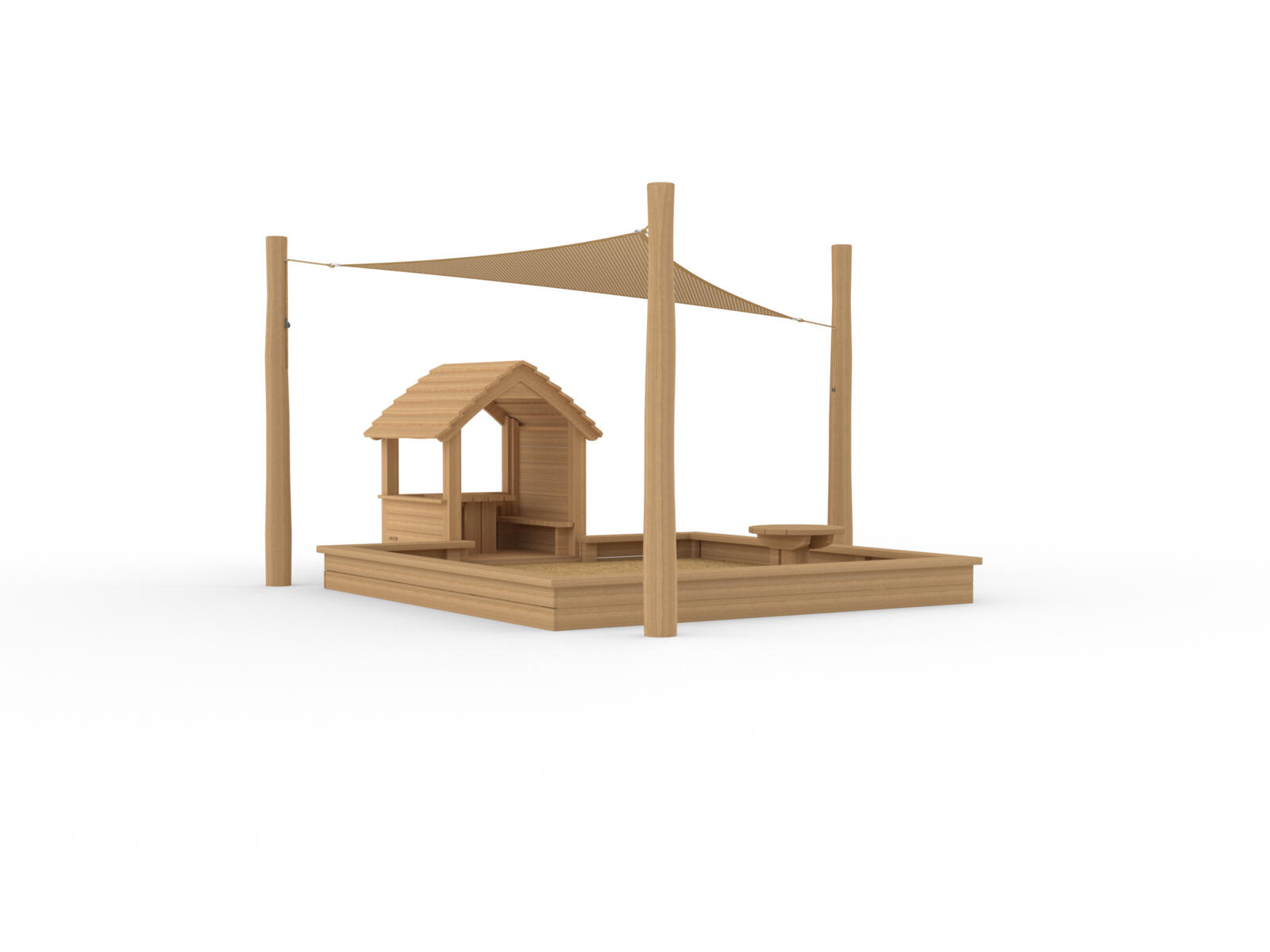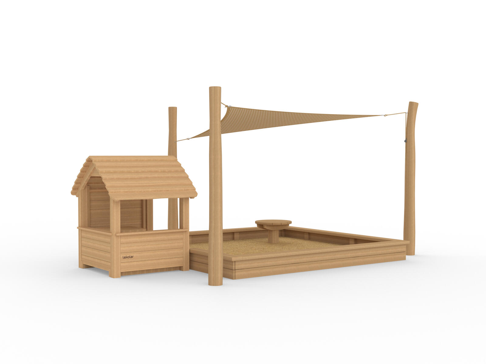 Med sitt naturliga intryck blir en lekhuset och sandlådan en mysig oas i utemiljön. Lekhuset är mångsidigt med en öppen design som inspirerar till fantasifull rollek. Inuti lekhuset är det inrett med bord och bänkar längs sidorna vilket gör det perfekt för både lek och avkoppling. Den breda kanten runt sandlådan fungerar både som en naturlig lekyta och en bekväm sittplats runt sandlådan. Bordet i sandlådan skapar bra förutsättningar för rollek och samarbete. Barnen kan tillsammans baka sandkakor, leka affär eller köra med olika fordon. Tillverkad av FSC-certifierad Robinia, ett träslag som är känt för sin höga motståndskraft mot väderpåverkan. Robinia absorberar minimalt med vatten och utmärker sig genom sin extremt långa hållbarhet. Monteras enligt installationsmanual.