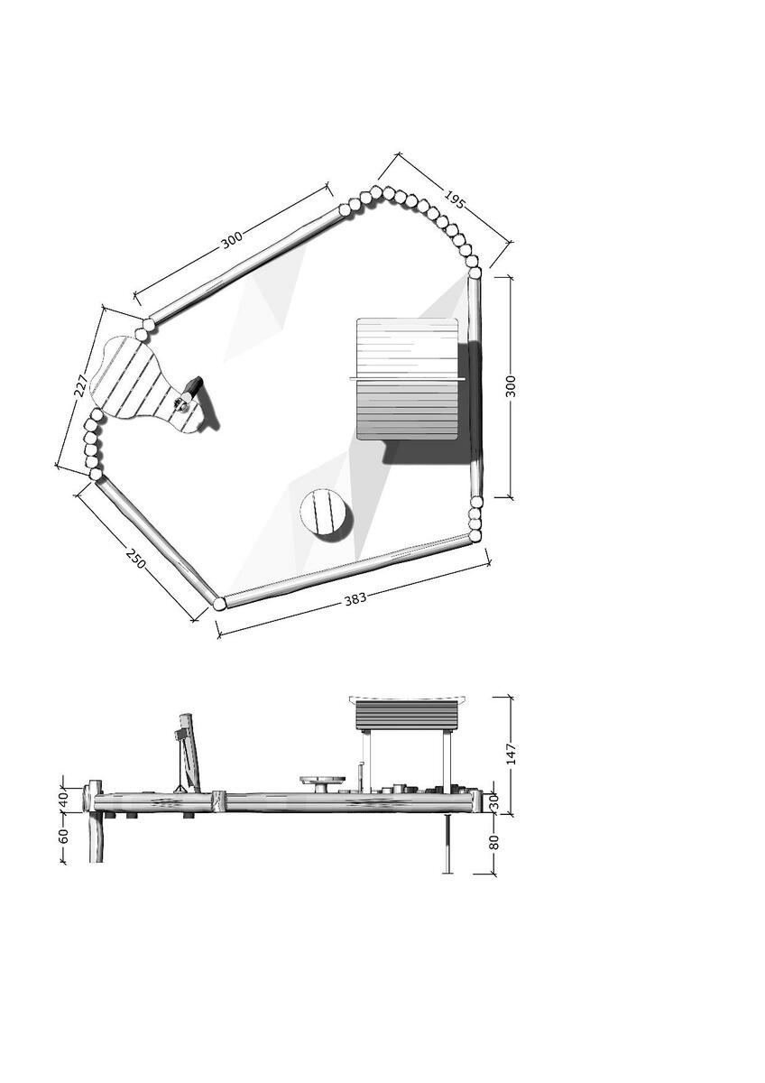 Lekhus med panel och "fönster" tillverkade av högtryckslaminat. Bas i Robinia, ett träslag som är väderbeständigt, tar upp lite vatten och är extremt hållbart. Vid installation ska alltid den medföljande manualen användas. Den senaste versionen finns att tillgå på begäran. Leverantörens artikelnummer Robinia RB1333