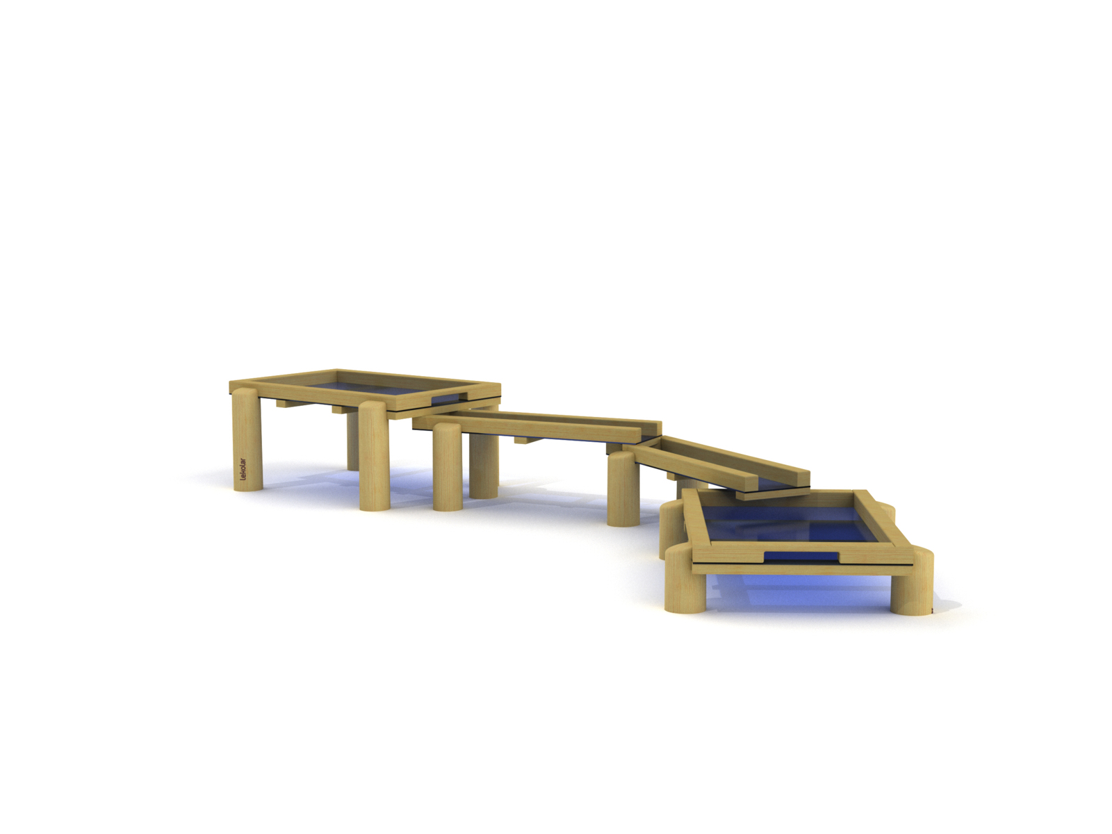 Ett vattensystem med vattenrännor som kan kombineras på olika sätt i utemiljön. Tillsammans kan de bidra till rolig vattenlek som uppskattas, roar och stimulerar de flesta barn i all oändlighet. Denna kombination består av 2 öppna rännor som är 2m långa och 1 ränna som är 1m lång och har en stängd sida. Tillverkad av FSC-certifierad Robinia, ett träslag med hög motståndskraft mot väderpåverkan. Det har förmågan att absorbera minimalt med vatten och utmärker sig genom sin extremt långa hållbarhet. Monteras enligt installationsmanual.