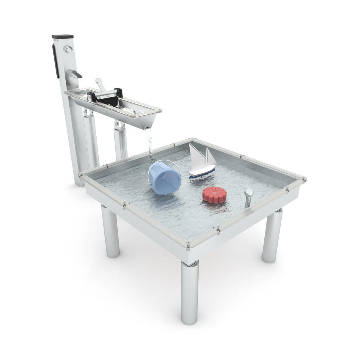 Ett roligt vattensystem av tåligt rostfritt stål där många barn kan leka tillsammans. Vattensystemet är utrustat med en tålig vattenränna med sluss, ett kar och en rolig vattenpump. För att undvika vassa kanter är de rostfria delarna klädda i transparent polykarbonat. Vattenpumpen höjer lekvärdet och kopplas enkelt ihop med trädgårdsslangen. Vattenlek uppskattas, roar och stimulerar de flesta barn i all oändlighet. Låt barnen utforska vattnets egenskaper, kontrollera vattnets rörelse och framfart i rännan. När flera barn leker tillsammans runt en balja tränas samarbete och turtagning. Vid installation ska alltid den medföljande manualen användas. Den senaste versionen finns att tillgå på begäran.