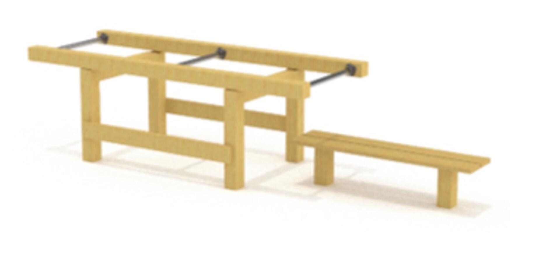 Liggande bröstpress i bekväm höjd. Tillverkad av svensk obehandlad lärk, ett hårt och tätt träslag med hög andel kärnvirke. Lärkens naturliga motståndskraft mot röta och väderpåverkan gör den idealisk för utomhusbruk utan behov av kemisk behandling. Lärk innehåller egna hartser som skyddar mot fukt, insekter och svamp.