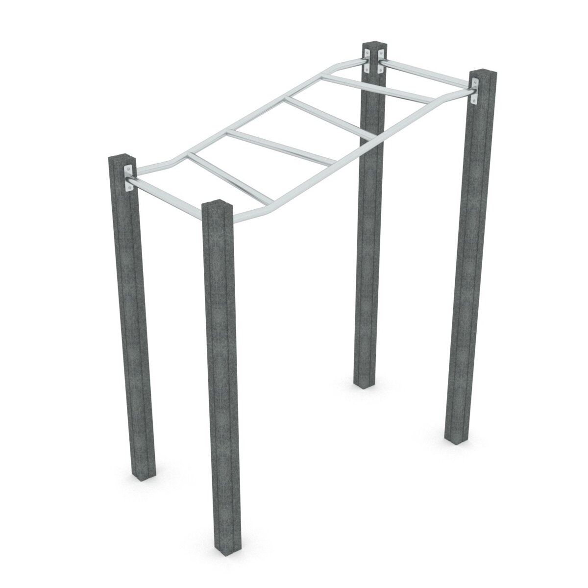 Skapa en inspirerande utemiljö som både utmanar och motiverar. En solid träningsutrustning där det ges möjlighet att träna allsidigt utomhus. Den horisontella stegen för dubbel armgång är ett klassiskt hinderbanemoment där man ska ta sig till andra sidan utan att använda fötterna. Denna konstruktion är baserad på återvunnet material. Alla stolpar är tillverkade av återvunnen textil. Några av många fördelar med detta material är att det inte rostar, inte absorberar vatten, är UV-resistent och ändå är lika hållbart som stål. Stålkonstruktionen är av galvaniserat och pulverlackerat stål. Monteras enligt installationsmanual. Vid installation ska alltid den medföljande manualen användas. Den senaste versionen finns att tillgå på begäran.