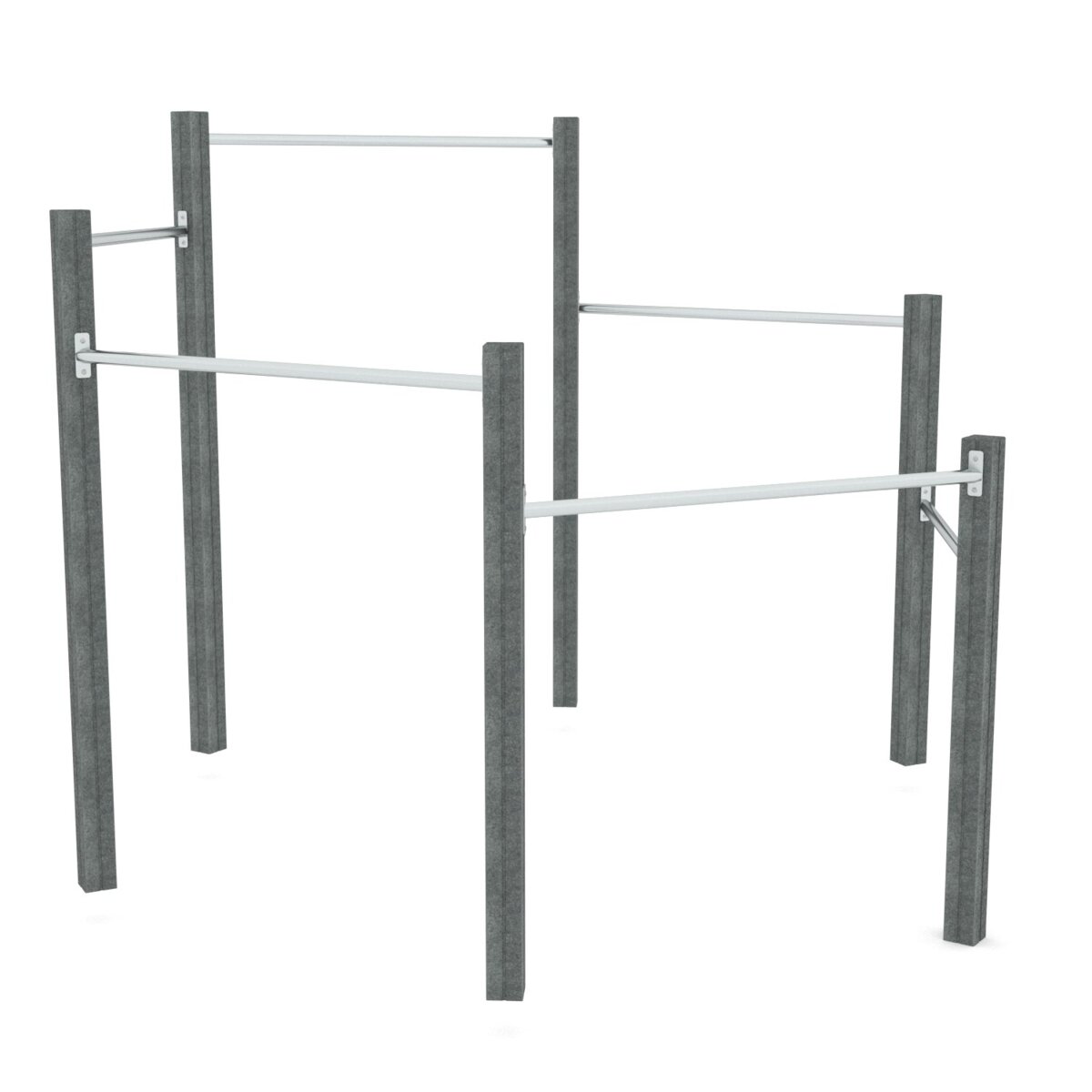 Skapa en inspirerande utemiljö som både utmanar och motiverar. En solid träningsutrustning där det ges möjlighet att träna allsidigt utomhus. En mångsidig träningsstation som kan användas på många sätt och av flera användare samtidigt. Övningarna varierar från vanliga pull ups till mer avancerade muscle ups. Denna konstruktion är baserad på återvunnet material. Alla stolpar är tillverkade av återvunnen textil. Några av många fördelar med detta material är att det inte rostar, inte absorberar vatten, är UV-resistent och ändå är lika hållbart som stål. Stålkonstruktionen är av galvaniserat och pulverlackerat stål. Monteras enligt installationsmanual. Vid installation ska alltid den medföljande manualen användas. Den senaste versionen finns att tillgå på begäran.