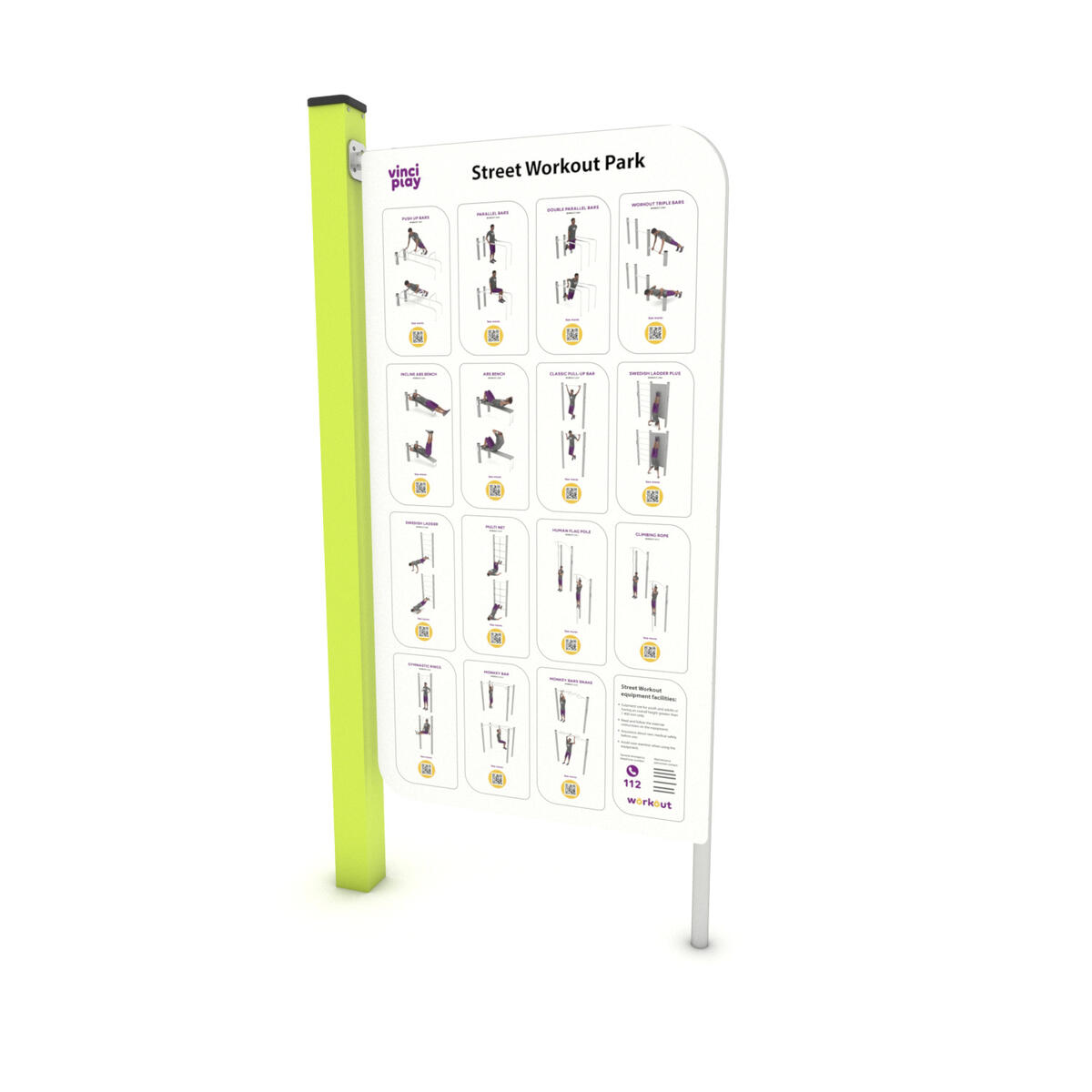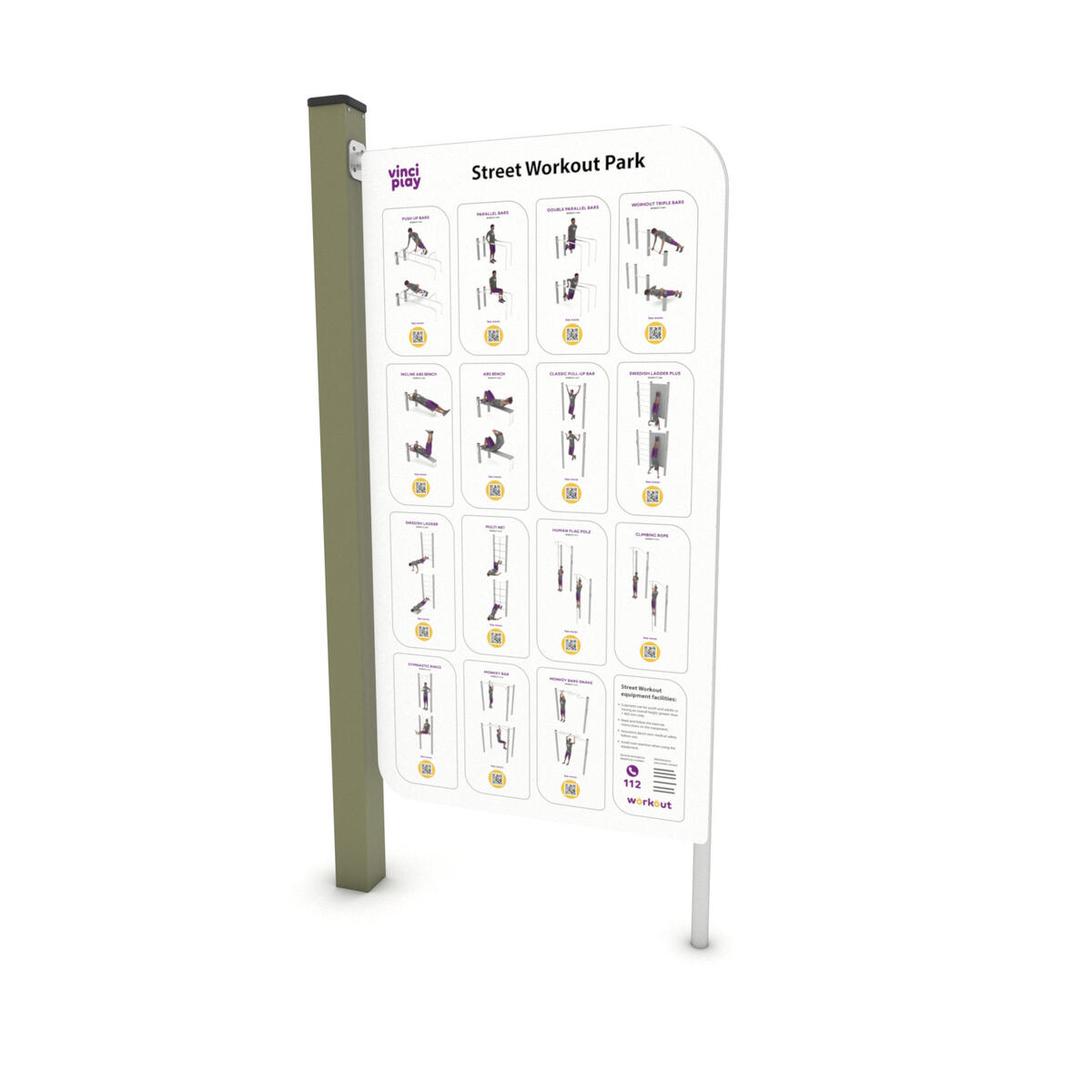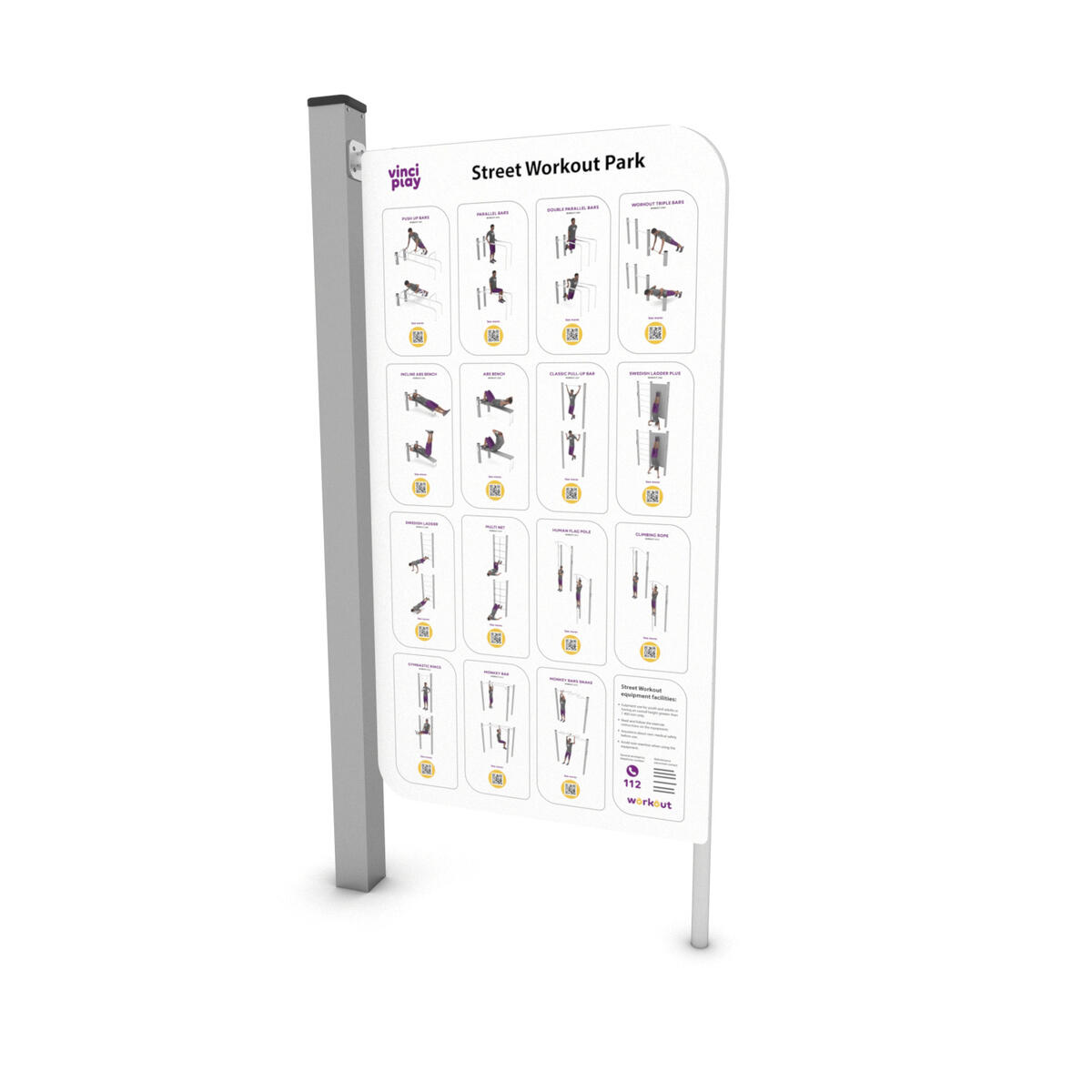 Workout är en serie träningsredskap främst avsedda för träning med kroppsvikten som utgångspunkt. Bas i pulvergalvaniserat och pulverlackerat stål. Färgen silver (-99) är tillverkad helt i rostfritt stål. Informationsskylten är tillverkad av aluminiumkomposit och har en kärna av polyeten. Kontakta kundtjänst vid beställning. Leverantörens artikelnummer Workout 2399