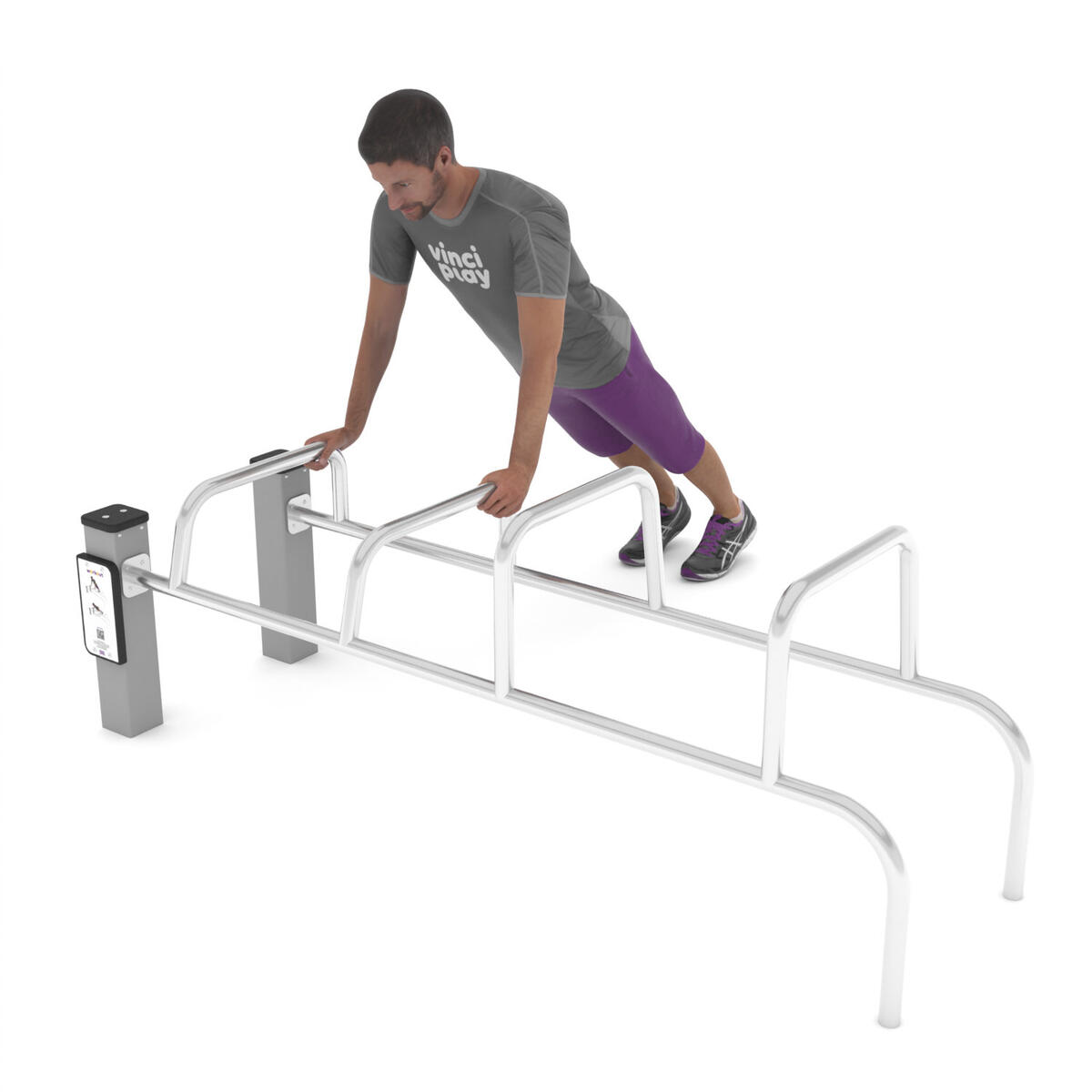 Workout är en serie träningsredskap främst avsedda för träning med kroppsvikten som utgångspunkt. Bas i pulvergalvaniserat och pulverlackerat stål. Färgen silver (-99) är tillverkad helt i rostfritt stål. Har en aluminiumskylt med träningsinstruktioner och QR-kod som leder till ett kort videoklipp med instruktioner. Leverantörens artikelnummer Workout 2301