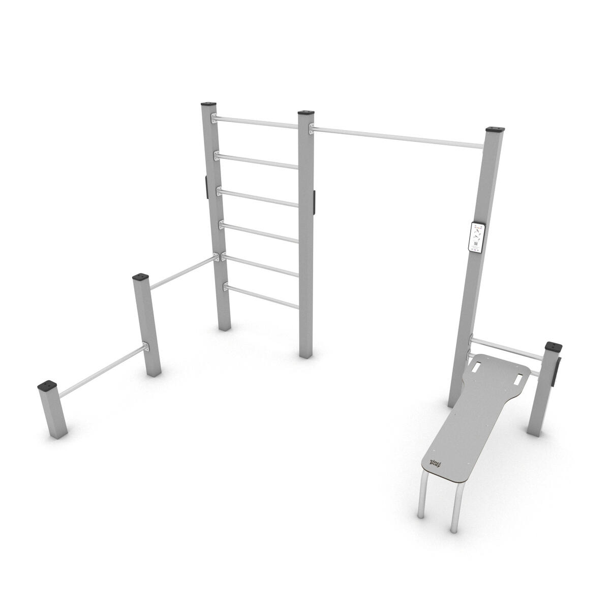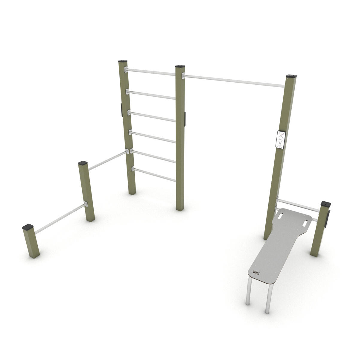Workout är en serie träningsredskap främst avsedda för träning med kroppsvikten som utgångspunkt. Bas i pulvergalvaniserat och pulverlackerat stål. Färgen silver (-99) är tillverkad helt i rostfritt stål. Har en aluminiumskylt med träningsinstruktioner och QR-kod som leder till ett kort videoklipp med instruktioner. Sitsar, ryggstöd och väggar är tillverkade i tåligt högtryckslaminat. Leverantörens artikelnummer Workout 2323