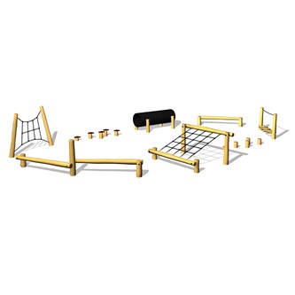 1 lektunnel, 2 klätternät, 1 balansbom, 2 balansgångar, 1 dubbelbalansgång och 1 balansbro. Grundstomme i trä. Material för markförankring ingår. Nedgrävning.