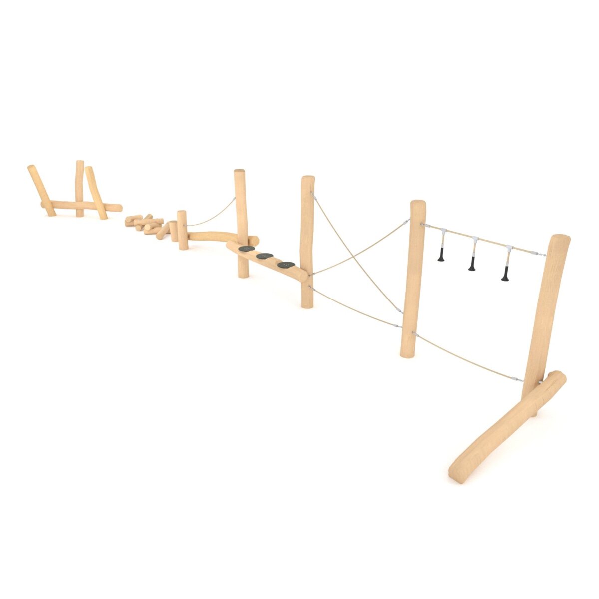 Balansbana med flertalet balans- och klätterelement. Bas i Robinia, ett träslag som är väderbeständigt, tar upp lite vatten och är extremt hållbart. Se produktblad för materialspecifikation.