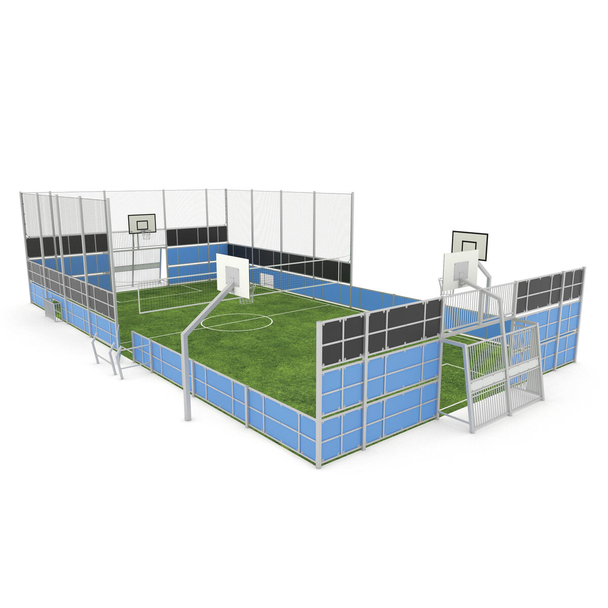 En multisportarena skapar möjligheter till spontan rörelse och aktivitet och blir en naturlig samlingsplats för alla åldrar. Denna arena är utrustad med 2 mål med måtten 320x110x210 cm och 4 basketmål med en höjd på 385 cm. Multiarenorna kan beställas i standardmått, eller efter specifika önskemål gällande mått och material. Kontakta våra säljare för pris och för att få en multisportsarena som passar just er. Vid installation ska alltid den medföljande manualen användas. Den senaste versionen finns att tillgå på begäran.